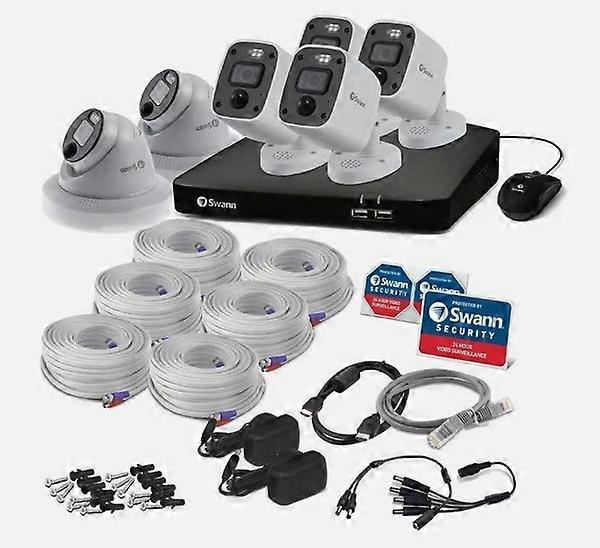 Heat and motion-based activity triggers red and blue flashing lights, bright spotlights and loud sirens to intimidate intruders and prevent crime. Activity can trigger push notifcations and recording, with microphones to provide live and recorded audio capture. Swann Security 4K Ultra HD Enforcer Bullet and Dome Cameras With police-style red and blue flashing lights and spotlights, the Enforcer can intimidate any intruders. See fine details in clear 4K Full HD, and with the Swann Security app you can receive push notifications, watch live or playback video on your smartphone. The cameras can withstand rain, snow and heat. There's free local recording, and you can upload video to Dropbox. Features Night2Day for colour video at any hour, powerful infrared night vision up to 40m and TrueDetect for heat and motion detection. Fine details are captured with 4K ultra HD video, which can be watched live or via playback using the Swann Security app on a smart device. Capable of recording video to large hard drive, with the option to upload video to Dropbox. Weatherproof camera designed to withstand the elements. Works with - Amazon Alexa - Google Home - iOS App - Android App Up to 4K Resolution Supports up to 8 Cameras Push & Email Notifications on Alarm Activation Real-Time Viewing & Video Record Continuous, Motion Detection, 40m Night Vision Range Night2Day Colour Video Hub Not Required 2TB DVR plus the option to save on to Dropbox Multi-camera live streaming that's always on Receive alerts when activity is detected See, store & playback footage on your mobile device Set up your devices & add services with ease Cameras with microphones to capture audio for identifying key details for you to act immediately or use at a later dateVideo in pro-quality Ultra HD to see everything that's happening live or in playback mode, plus you can zoom in close to see car license plates, faces & so much moreGet color video at night up to 32ft (10m) with the light