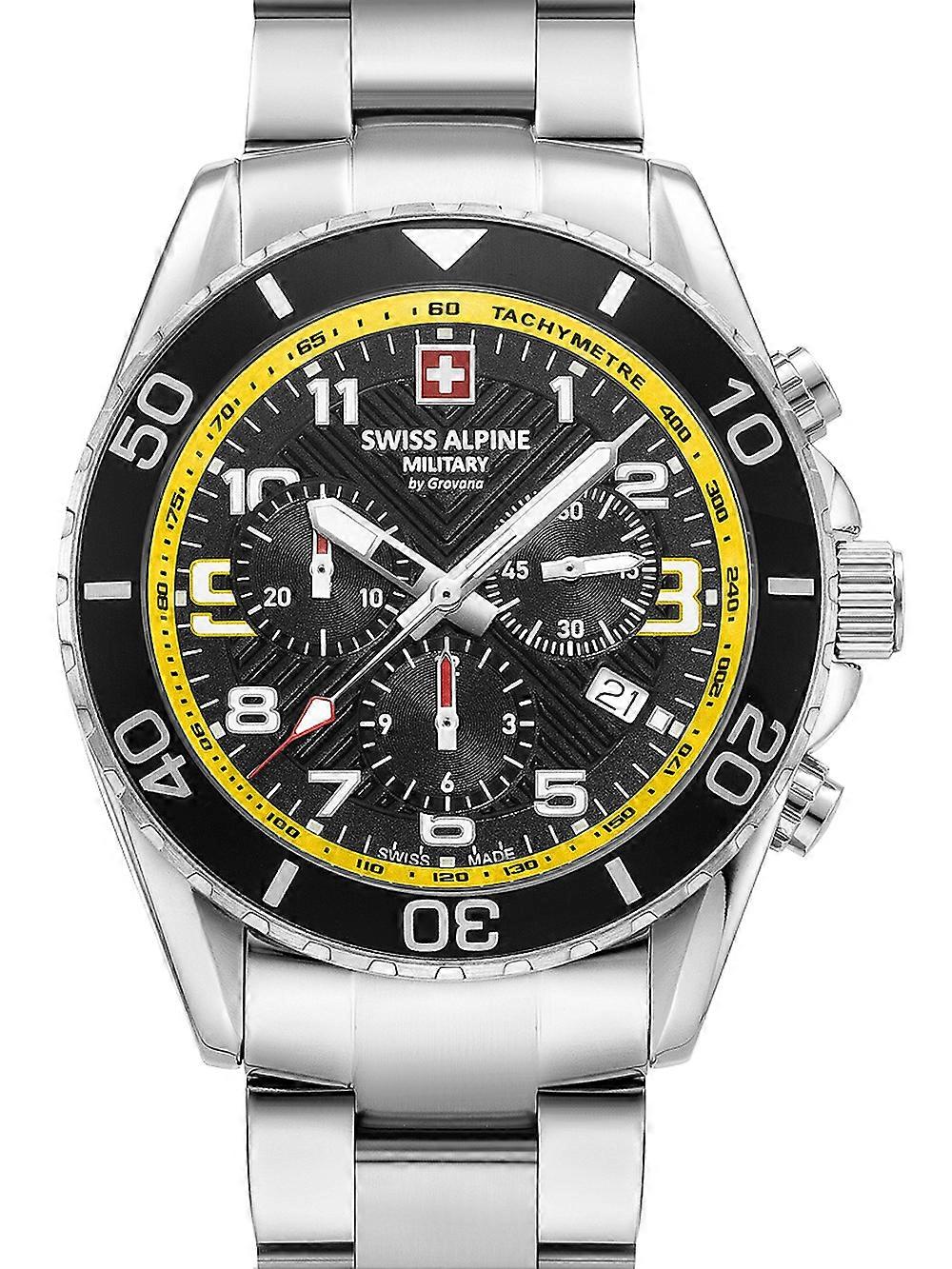 Marke: Swiss Alpine Military • Hersteller-Nr.: 7029.9138 • Hersteller Serie: Raptor Chronograph 42 mm • Funktionen: Chronograph, Datum, Minute, Sekunde, Stunde • Antrieb: Batterie (Quarz) • Uhrwerk Bezeichnung: 5030.D, Ronda, Swiss-Made • Zifferblatt Farbe: Gelb, Schwarz • Anzeige: Analog • Wasserdichte: 10 ATM • Lünette: Feststehend, mit 60 Min. Teilung • Oberfläche: Mattiert, Poliert • Gehäuse Farbe: Silber • Gehäuse Material: Edelstahl • Gehäusedicke: 11 mm • Gehäuse Form: Rund • Gehäusebreite: 42 mm • Gehäuseboden: Edelstahlboden, verschraubt • Geschlecht: Herren • Glas: gehärtet, Mineralglas • Beleuchtung: Leuchtindexe, Leuchtzeiger • Stil: Sportlich • Armband Material: Edelstahl • Armband Farbe: Silber • Bandanstoßbreite: 22 mm • Schließe: Faltschließe • Max. Handgelenkumfang: 220 mm • EAN: 7611751179568 • Artikelgewicht: 0.17 kg ★★★ To our non EU customers: logistics will request local tax from you + a little service fee ★★★