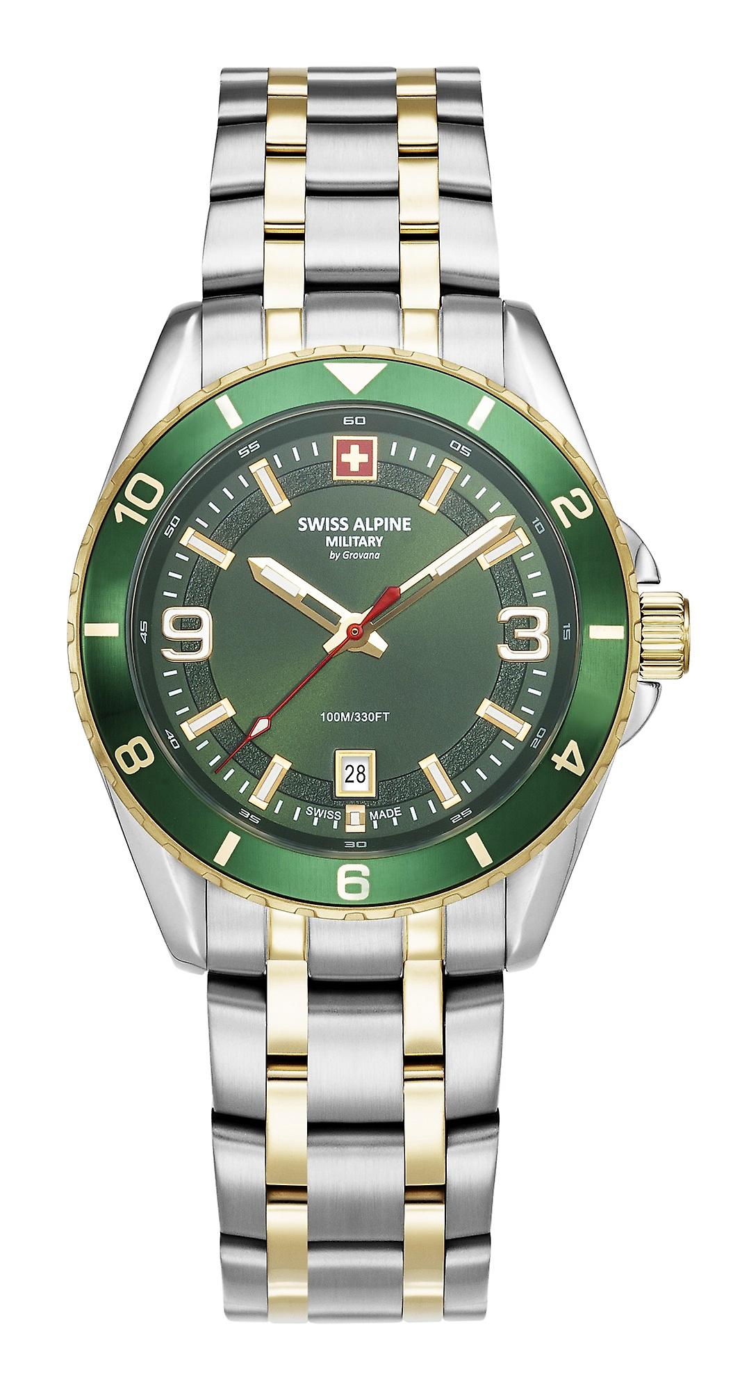 Hersteller:Swiss Alpine Military by Grovana ModellNr :7034.1144SAM Zifferblatt:analog, Farbe: grünTechnik:Schweizer QuarzwerkGehäuse:Edelstahlgehäuse bicolor, Lünette grün, Durchmesser : ca. 4,2 cm, Stärke: ca. 1,0 cm, Gewicht: ca, 152 GrammGehäuseboden:Edelstahlboden mit Herstellerlogo,Armband:Edelstahlarmband bicolor mit TaucherverschlussBreite:ca. 2,2/2,0 cmLänge d.Uhr (Gesamtlänge): ca. 26,5 cmDichtheit:10 ATM (100 m Wasserdicht)Funktionen / Anzeigen: Swiss Made Schweizer Quarzwerk Gehärtetes Mineralglas Datumsanzeige auf 6 Uhr Stunden- Minuten - Sekundenanzeiger Leuchtzeiger und IndexeLieferumfang:Auslieferung in Swiss Alpine Military Verpackung
