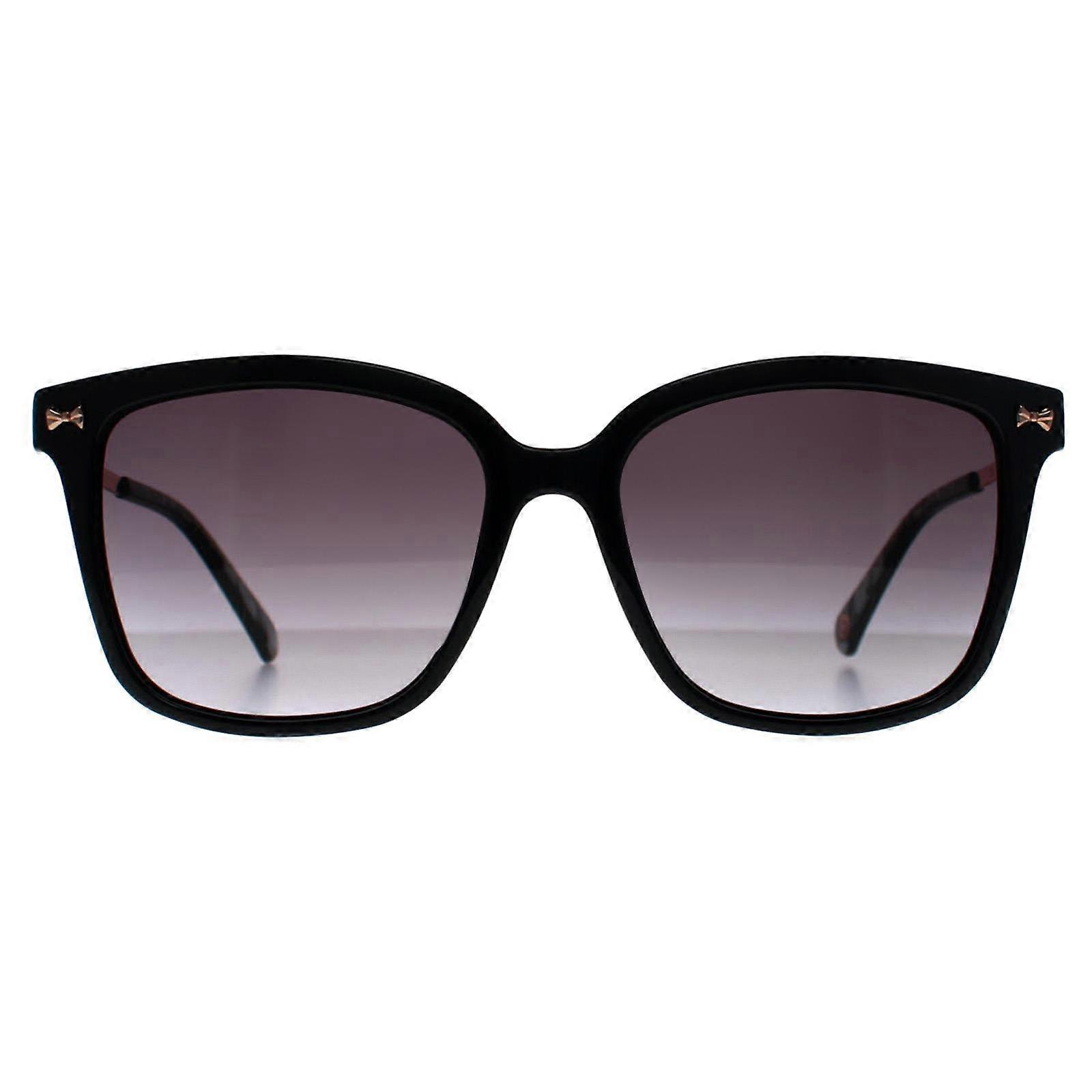 Ted Baker Sunglasses TB1439 Elin 012 Black Gold Floral Grey Gradient feature a bold square acetate frame designed for women, they showcase Ted Baker's signature 3D metal bow detail on the temples, adding a touch of elegance. The lenses offer full UV protection, ensuring both style and functionality. These sunglasses are ideal for those seeking a statement piece that combines classic design with contemporary flair.