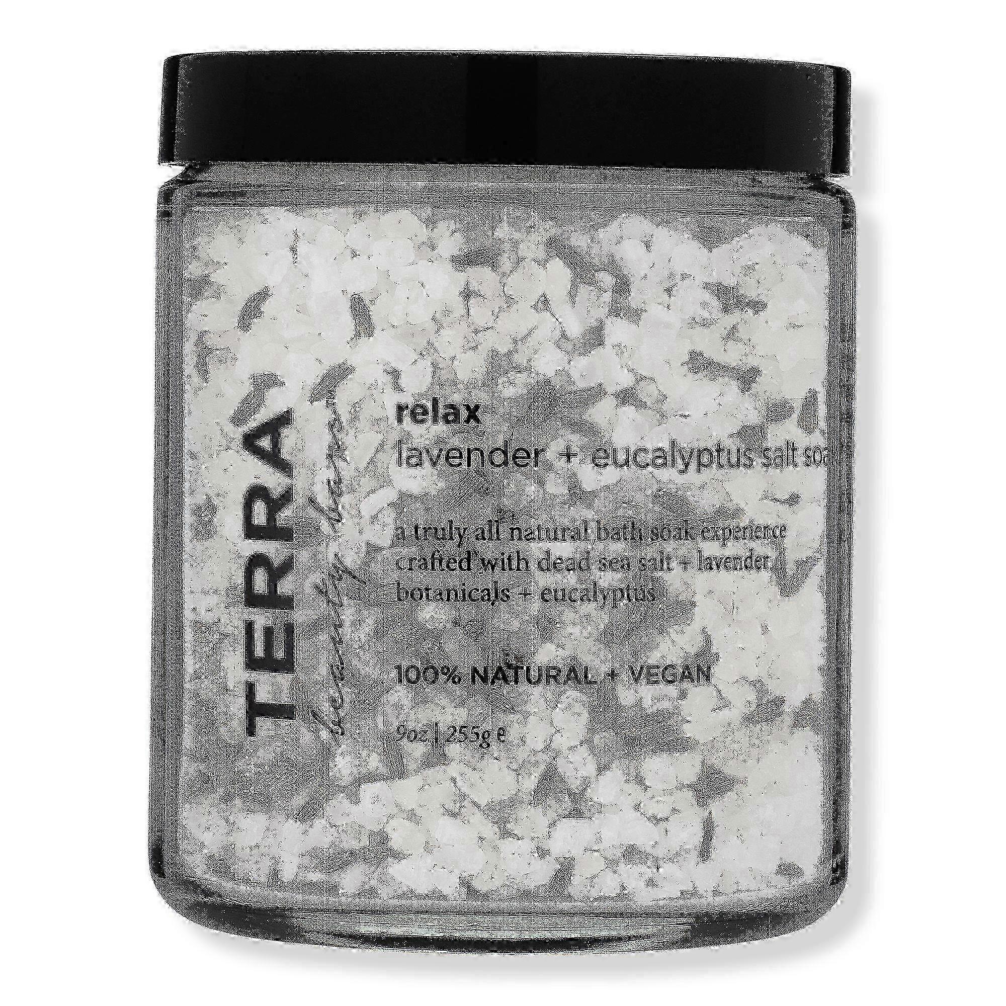 Suggested Use: Terra Beauty Bars Relax Lavender + Eucalyptus Salt Soak Bath is made with plant powered, flower infused natural soaking bath salts for a relaxing. . .