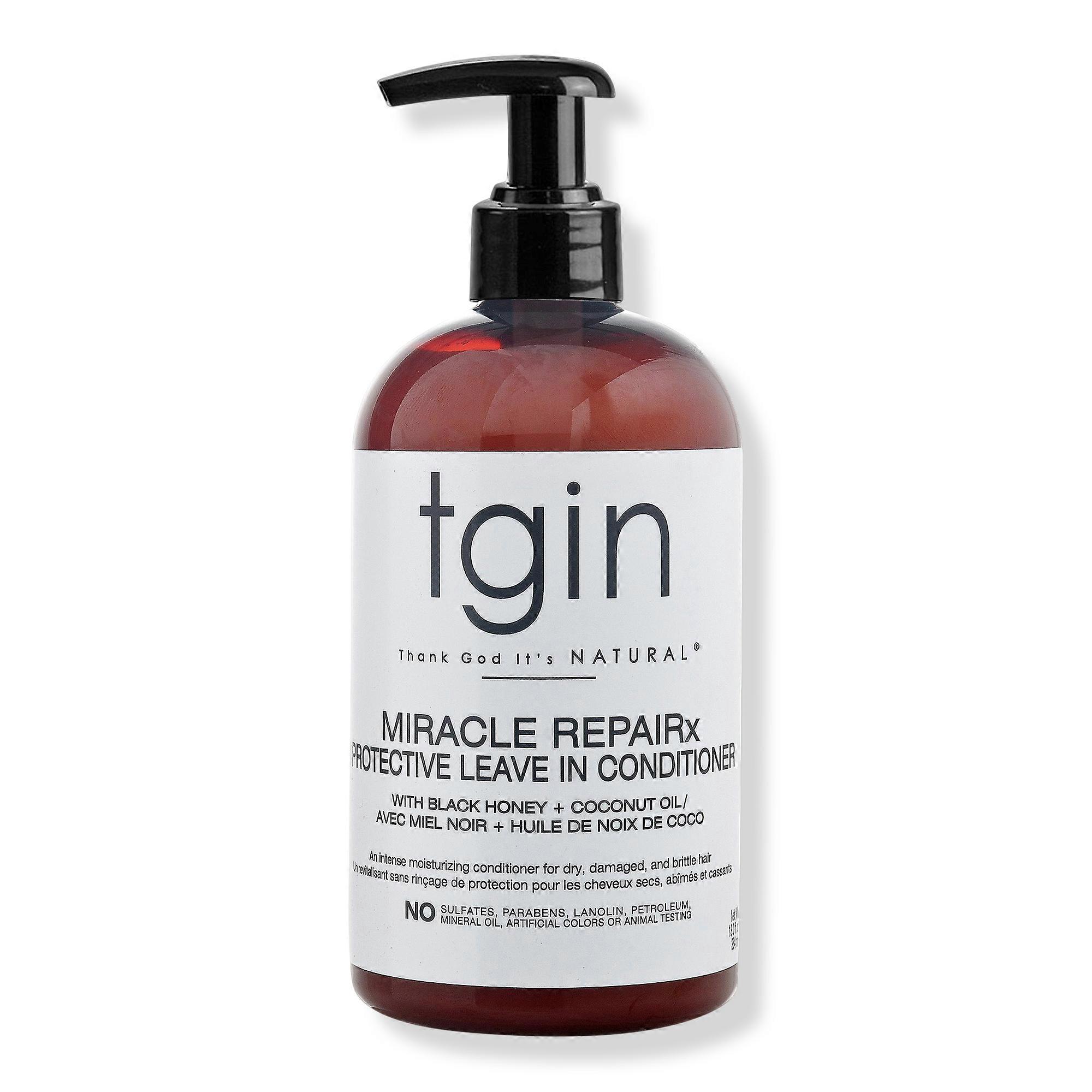 The tgin Miracle RepaiRx Protective Leave In Conditioner is a lightweight hair conditioner designed to moisturize, define, and restore softness and shine to hair. Enriched with coconut oil and black honey, it helps reduce split ends, improve manageability, and promote healthy hair. Ingredients Black Castor Oil: Moisturizes and strengthens hair, while supporting scalp health. Biotin: Supports healthy hair by restoring strength, improving texture, and aiding length retention. Free From: Parabens Sulfates Petrolatum Lanolin Artificial colors Suggested Use Wash hair using the tgin Miracle RepaiRx Strengthening Shampoo to cleanse and remove buildup. Follow with the tgin Miracle RepaiRx Strengthening Conditioner and rinse thoroughly. Apply the tgin Miracle RepaiRx Protective Leave In Conditioner to damp hair and style as desired. For external use only. Keep out of reach of children.