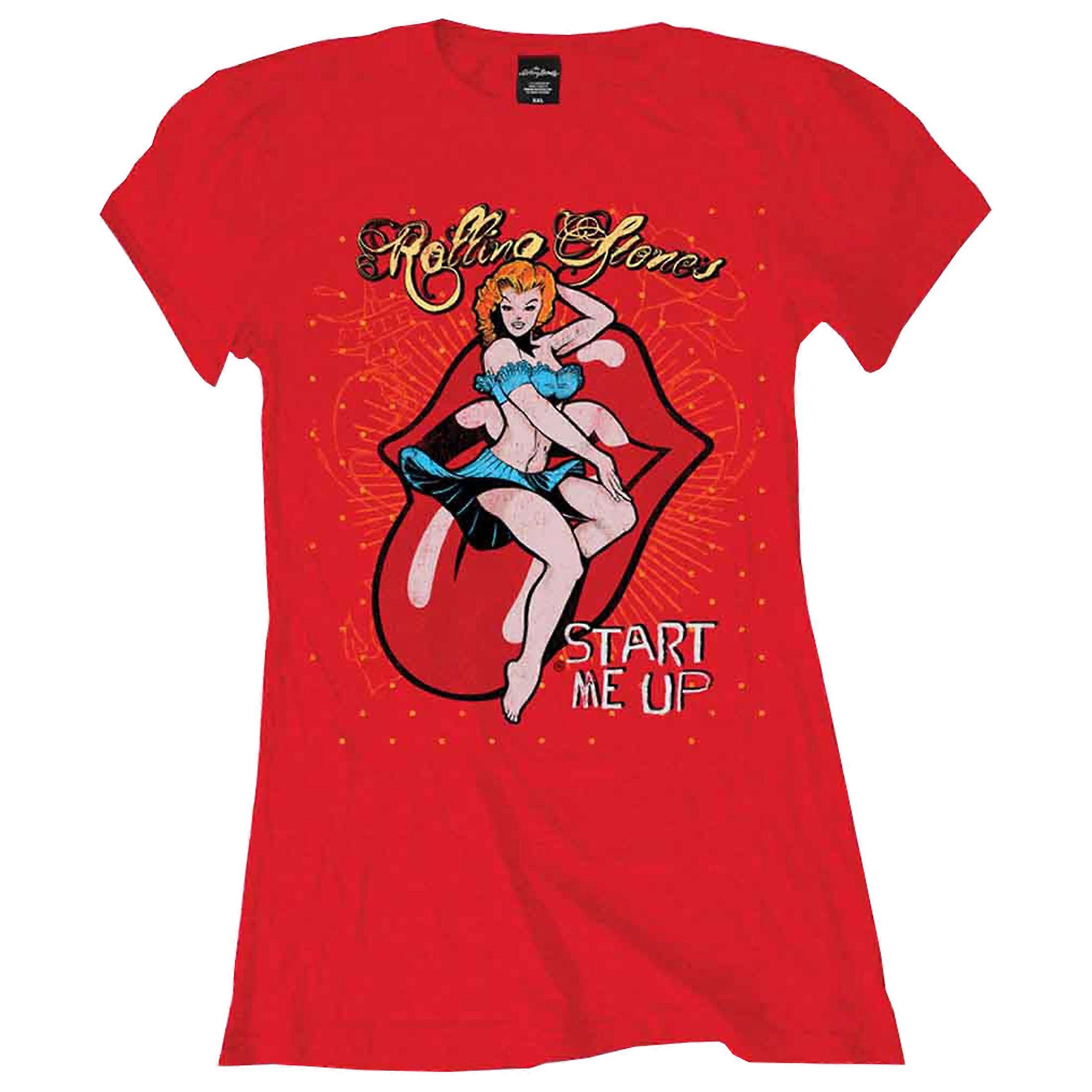 An official licensed The Rolling Stones Ladies Tee featuring the 'Start me up' design motif. This high quality t-shirt design is available in the red colourway. We offer a range of sizes from Small through XX-Large, subject to stock availability.