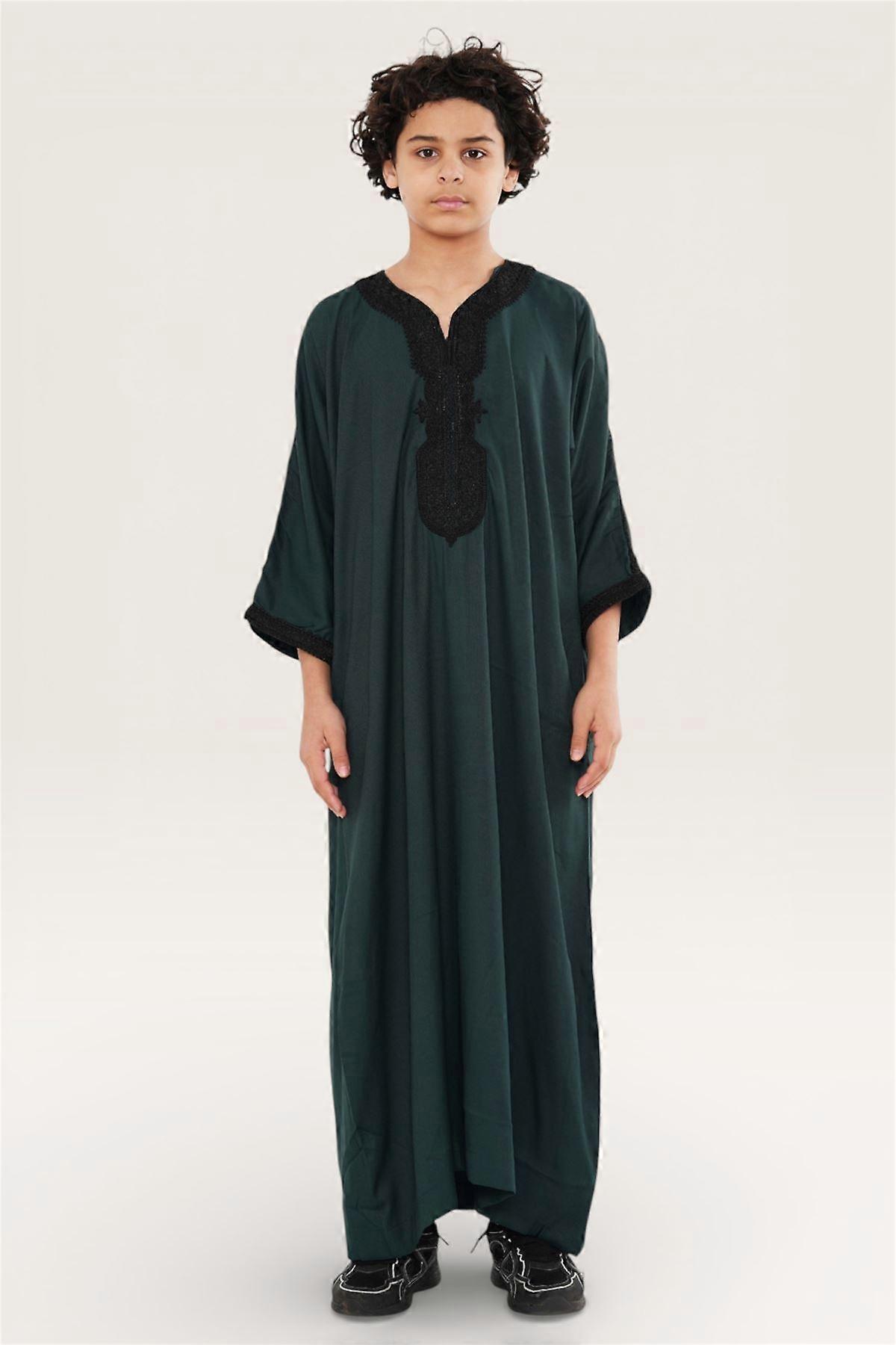 Kids Boys Green Moroccan Thobe Jubba Robe Djellaba Arab Short Sleeve Black Embroidery Gandoura