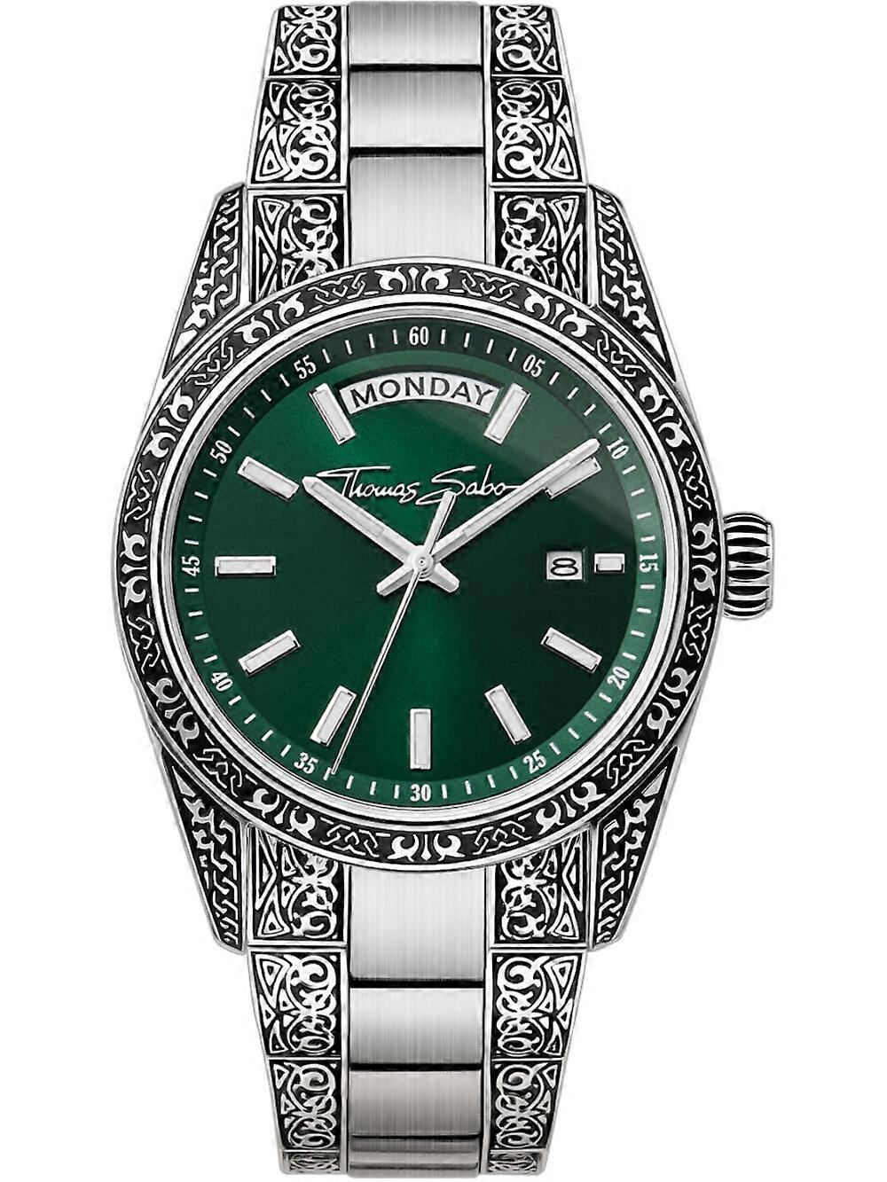 Marke: THOMAS SABO • Hersteller-Nr.: WA0426-201-201 • Hersteller Serie: Rebel At Heart Revive 36mm 5ATM • Funktionen: Datum, Minute, Sekunde, Stunde, Wochentag • Antrieb: Batterie (Quarz) • Uhrwerk Bezeichnung: 2315, Miyota • Zifferblatt Farbe: Grün • Anzeige: Analog • Wasserdichte: 5 ATM • Lünette: Feststehend • Oberfläche: Mattiert, Poliert • Gehäuse Farbe: Silber • Gehäuse Material: Edelstahl • Gehäusedicke: 11 mm • Gehäuse Form: Rund • Gehäusebreite: 36 mm • Gehäuseboden: Edelstahlboden, verschraubt • Geschlecht: Damen, Herren, Unisex • Glas: Mineralglas, Saphirbeschichtet • Beleuchtung: Leuchtindexe, Leuchtzeiger • Stil: Modern • Armband Material: Edelstahl • Armband Farbe: Silber • Bandanstoßbreite: 20 mm • Schließe: Faltschließe • Max. Handgelenkumfang: 205 mm • EAN: 4051245603330 • Artikelgewicht: 0.12 kg ★★★ To our non EU customers: logistics will request local tax from you + a little service fee ★★★