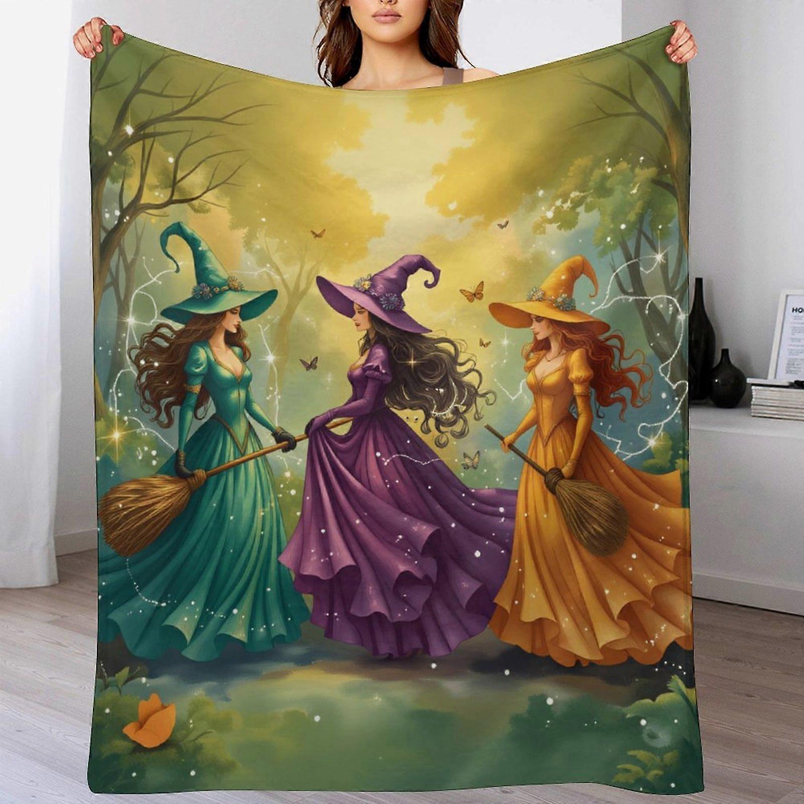 Three Witches Print Flannel Blanket - Soft Warm Throw | Whimsical Halloween Decor for Fantasy Lovers