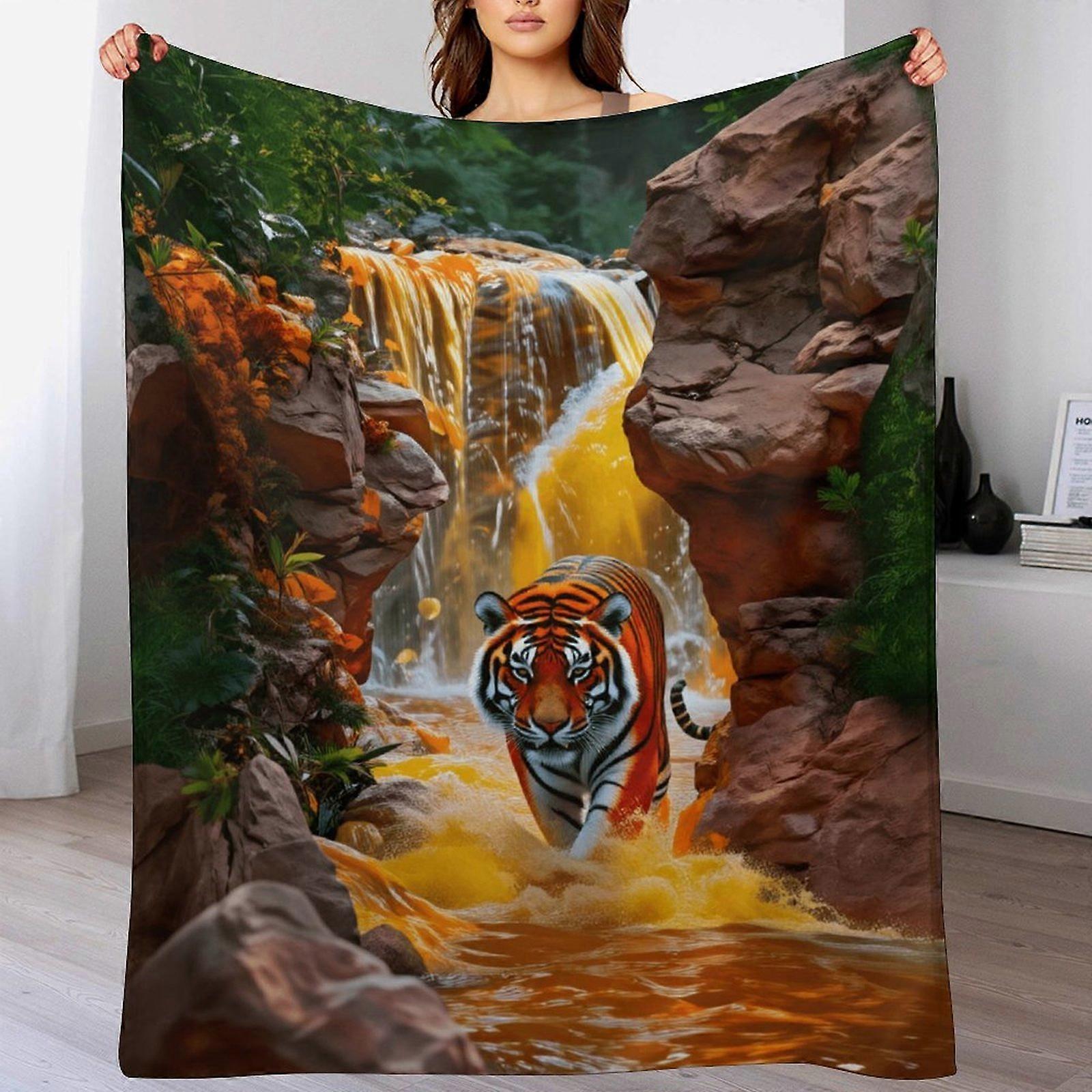 Tiger in Waterfall Print Flannel Blanket - Cozy Warm Throw | Nature Animal Decor for Outdoor Enthusiasts