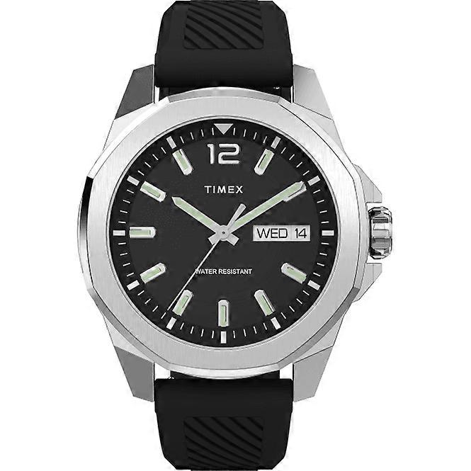 Timex Gents Essex Black Watch TW2W42900 Discover the perfect blend of style and functionality with the Timex Gents Essex Black Watch TW2W42900. This remarkable timepiece is designed for the modern gentleman who appreciates a sophisticated look without compromising on durability. With its understated elegance, this watch enhances any attire, making it a versatile accessory for both everyday wear and special occasions. Case Material - Low Lead BrassCase Colour/Material - Silver-ToneCase Shape - RoundCase Dimension - 46 mmCase Thickness - 10 mmDial Crystal Type - Mineral GlassDial - BlackStrap Material - SiliconeStrap Colour - BlackStrap Band Width (mm) - 22mmStrap Band Length (mm) - 84mm x 122mmBuckle - BuckleMechanism - Quartz AnalogWater Resistance (ATM) - 50 metersProduct Weight (Grams) - 75.0Battery Number - SR927SWBattery Type/Composition - Silver oxide The Timex Essex Black Watch features a striking black-tone dial that captures attention with its minimalist design. Simple markers adorn the dial, ensuring clarity while maintaining a contemporary aesthetic. The day and date window positioned at 3 o'clock adds practicality, allowing you to keep track of your schedule effortlessly. The watch is equipped with a robust 46mm low lead brass case that combines resilience and luxury, making it an ideal choice for the discerning wearer. Designed with both style and functionality in mind, this watch comes complete with a silver-tone octagonal top ring that adds a touch of sophistication. The sturdy crown protector ensures that the watch withstands daily wear, while the water-resistant feature protects against splashes and rain with a depth rating of up to 50 meters. Comfortable Silicone Strap: The black textured silicone strap provides a secure and comfortable fit, perfect for all-day wear. Quartz Movement: The reliable quartz analog mechanism guarantees precise timekeeping, so you never miss a moment. With a case thickness of just 10mm, the watch sits elegantly on the wrist without feeling bulky. The durable mineral glass dial crystal protects against scratches, maintaining the watch's pristine appearance over time. Timex takes pride in quality, and each product comes beautifully presented in branded packaging, complete with a gift bag, box, and a certificate of authenticity. Choose the Timex Gents Essex Black Watch TW2W42900 for a timepiece that exemplifies luxury, durability, and precision. Enjoy peace of mind with a full warranty covering manufacturing and material defaults for up to two years from the date of purchase. Elevate your watch collection today with this exceptional piece.