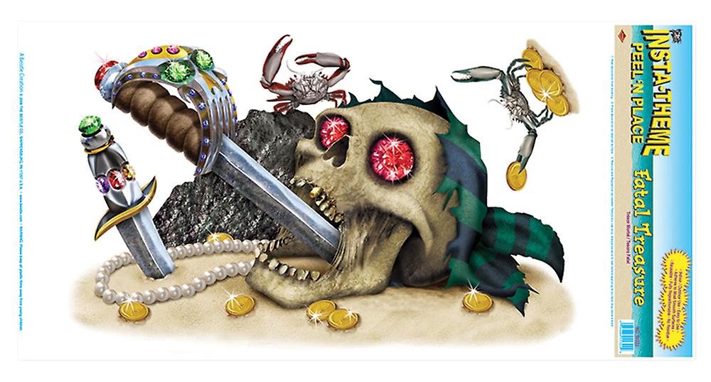 The Perfect Decoration For Any Pirate Party For Kids Or Adults. Picture Of Ruby-Eyed Skull On The Ocean Floor With Jewel-Handled Sword Sticking Out Of The Skeletons Mouth While Lobsters Walk Around With More Gold And Jewels. Item Measures 12 Inches X 24 Inches. © 2018 The Beistle Company.