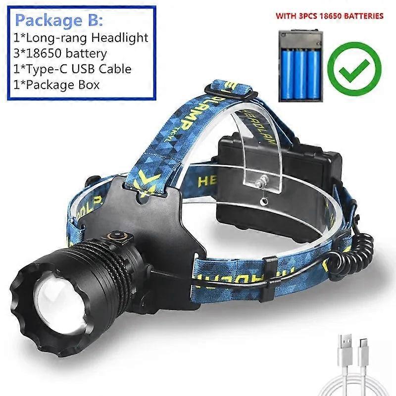 Ultra Bright Led Headlamp - Zoomable, Long-range Spotlight For Outdoor Fishing. Illuminate Your Adventures with This High-performance LED Headlamp, Perfect for Hiking, Camping, Fishing, and More. Crafted from Durable Aluminum Alloy, It's Designed to Withstand Outdoor Elements with Its Living Waterproof Feature. The Telescopic Zoom Allows You to Adjust the Focus, While the 1000-meter Range Ensures You See Clearly in Any Situation. With Three Lighting Modes—strong Light, Low Light, and Flash—you Can Tailor the Brightness to Your Needs. The Push Switch Provides Easy Operation, and the Type-C USB Fast Charging Ensures Your Headlamp is Ready Whenever You Are. Choose Between Packages with or Without the Included 18650 Batteries. Features: - Battery Type: Lithium Ion - Light Source: LED Bulbs with Four Long-range Lamp Beads - Brightness Modes: High, Low, Flash - Zoom Mode: Telescopic Zoom - Waterproof: Yes (Living Waterproof) - Range: Up to 1000 Meters - Material: Durable Aluminum Alloy - Switch: Easy Push Switch - Charging Method: Type-C USB Fast Charging - Applications: Ideal for Wild Exploration, Mountaineering, Hunting, Hiking, Fishing, Emergencies, Camping, and Self-defense - Package Options: - Package A: Headlamp, Type-C USB Cable, Package Box (Batteries Not Included) - Package B: Headlamp, 3 X 18650 Batteries, Type-C USB Cable, Package Box.