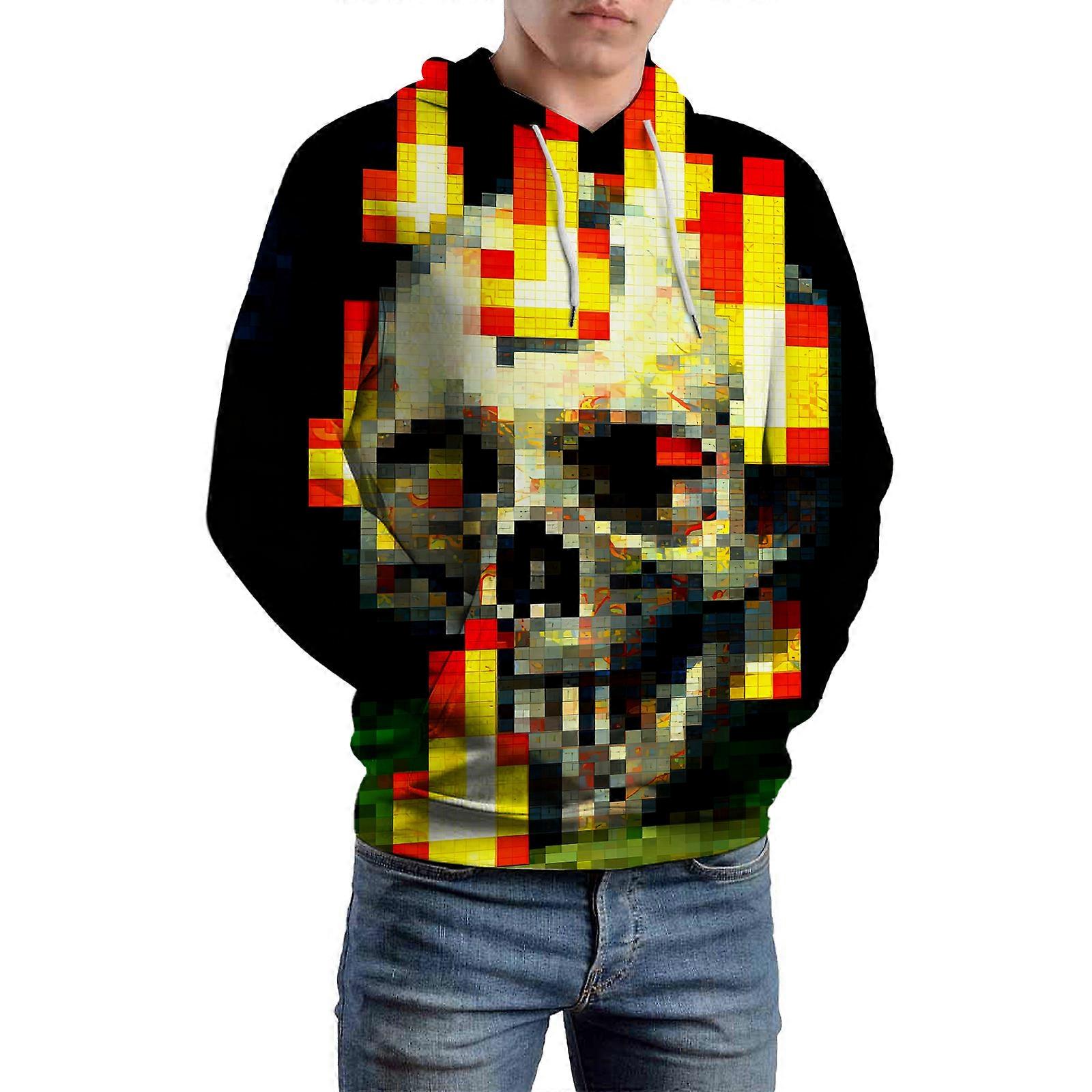 Unisex Pixel Art Skull Graphic Hoodie - Bold Color Block Print Pullover for Men