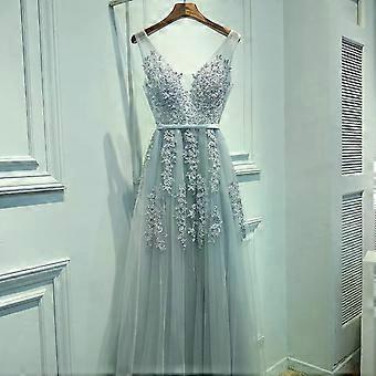 V-neck Evening Dress-Sexy Tulle Applique,Silver Gray,Size S Silver Gray,S