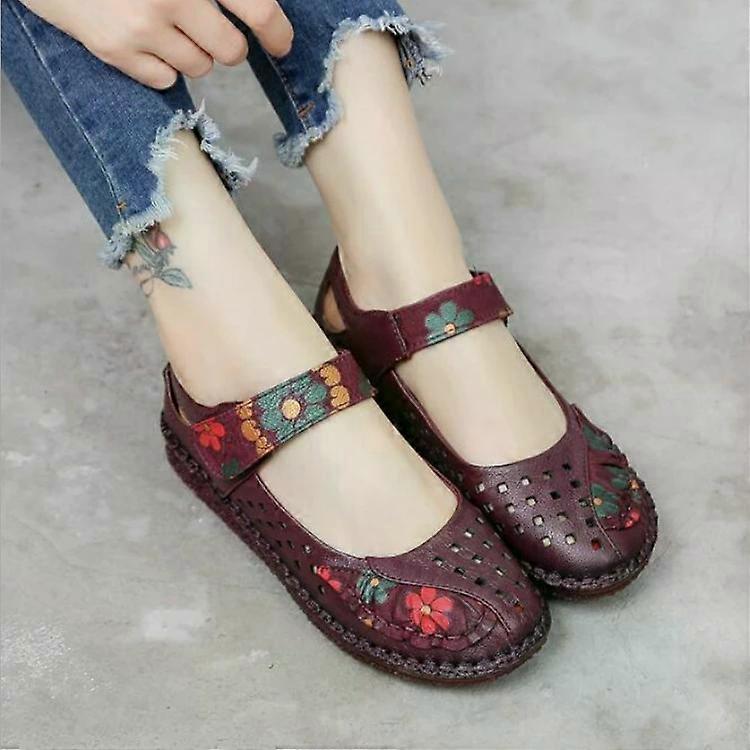 Vintage Leather Flat Shoes-Flower Design,Soft Bottom,Size 40,Purple Purple Sandals,40