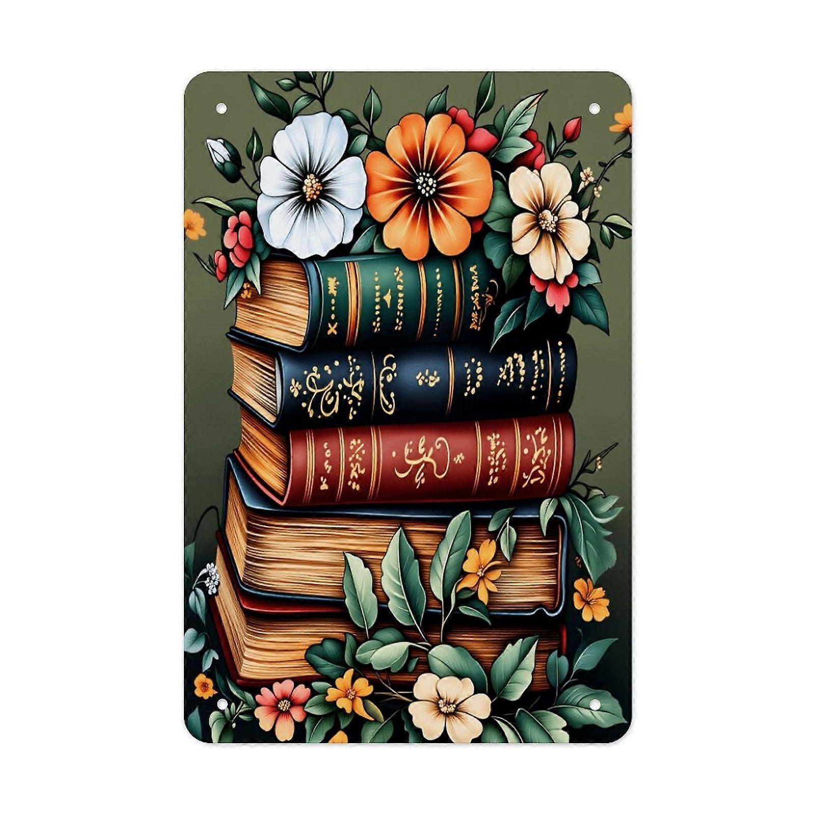 Vintage Stacked Books & Floral Graphic Tin Sign Metal Wall Art Botanical Home Decor