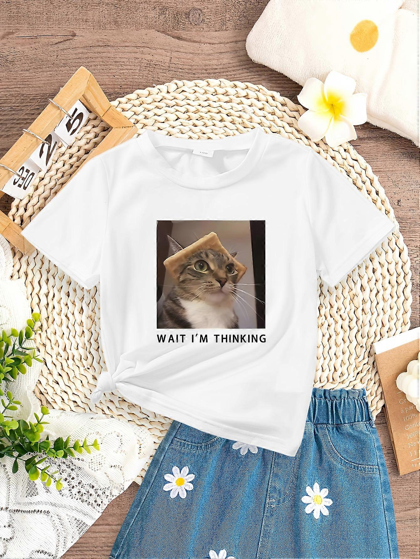 Wait I'm Thinking Funny Cat Graphic Women's Crewneck Casual Short Sleeve T-Shirt Summer Fashion Streetwear Tops Tees
