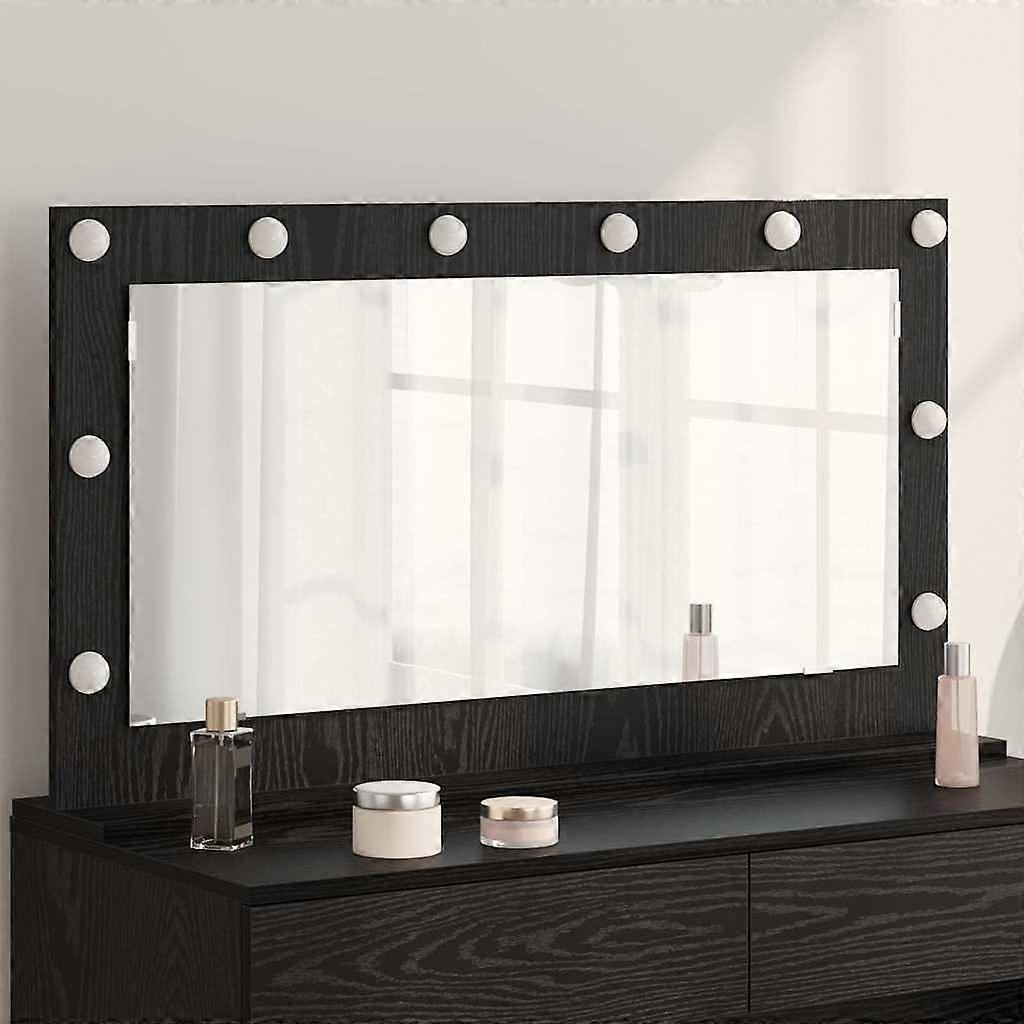 Farbe: Schwarz Eichen-OptikMaterial: Glas und furniertes HolzGesamtabmessungen: 100 x 55 x 18 cm (L x B x H)Form: RechtwinkligLichttyp: LED-StreifenFarbe der Lichter: Warmes WeißSpannung: 5Gewicht: 13,1 kgLanglebigNur für den InnenbereichMontage erforderlich: JaLieferumfang:1 x Kosmetikspiegel