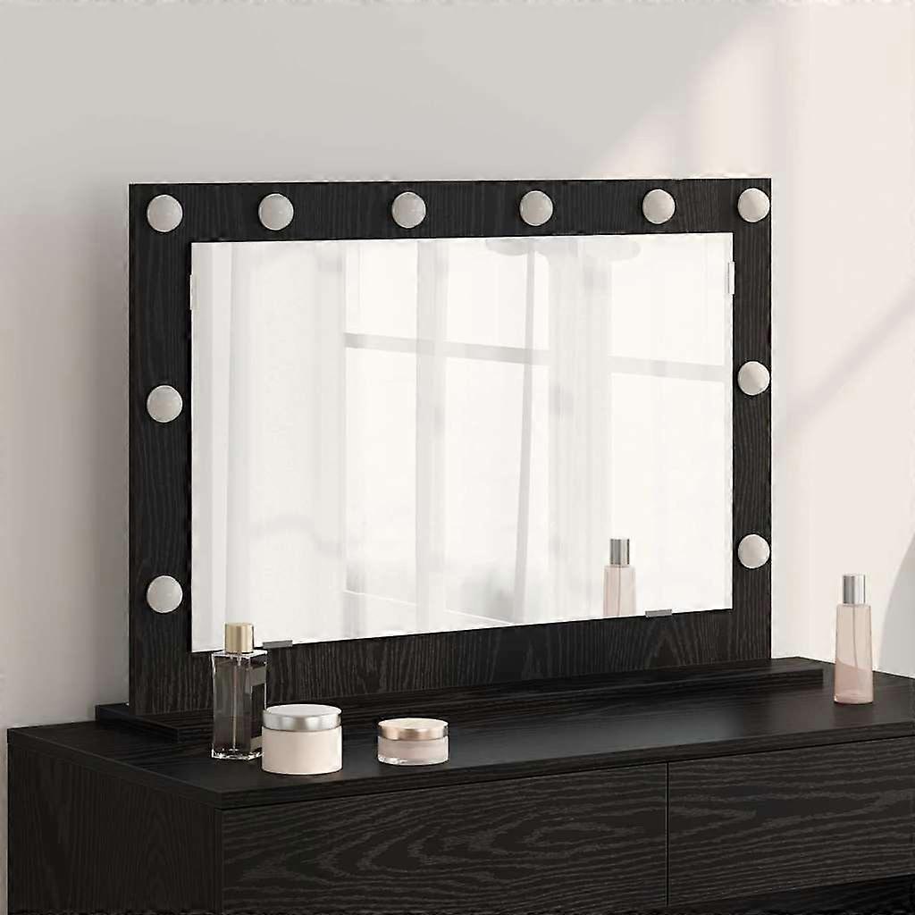Farbe: Schwarz Eichen-OptikMaterial: Glas und furniertes HolzGesamtabmessungen: 80 x 15 x 18 cm (L x B x H)Form: RechtwinkligLichttyp: LED-StreifenFarbe der Lichter: Warmes WeißSpannung: 5Gewicht: 10,35 kgLanglebigNur für den InnenbereichMontage erforderlich: JaLieferumfang:1 x Kosmetikspiegel