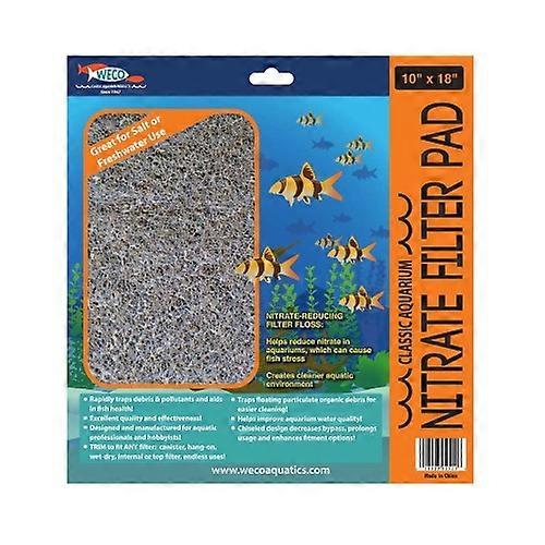Weco Nitrate-Reducing Filter Pad helps reduce nitrate in aquariums, which can cause fish stress. Great salt and freshwater use. Creates cleaner aquatic environment. Rapidly removes floating particulate organic debris for easier cleaning Excellent quality and effectiveness Designed and manufactured for aquatic professionals and hobbyists. Trim to fit any filter: canister, hang-on, wet-dry, internal or top filter, endless uses Helps improve aquarium water quality. Chiseled design decreases bypass, prolongs usage and enhances fitment options. Package is designed with freshwater fish on one side and saltwater fish on the other to suit your stores display needs.