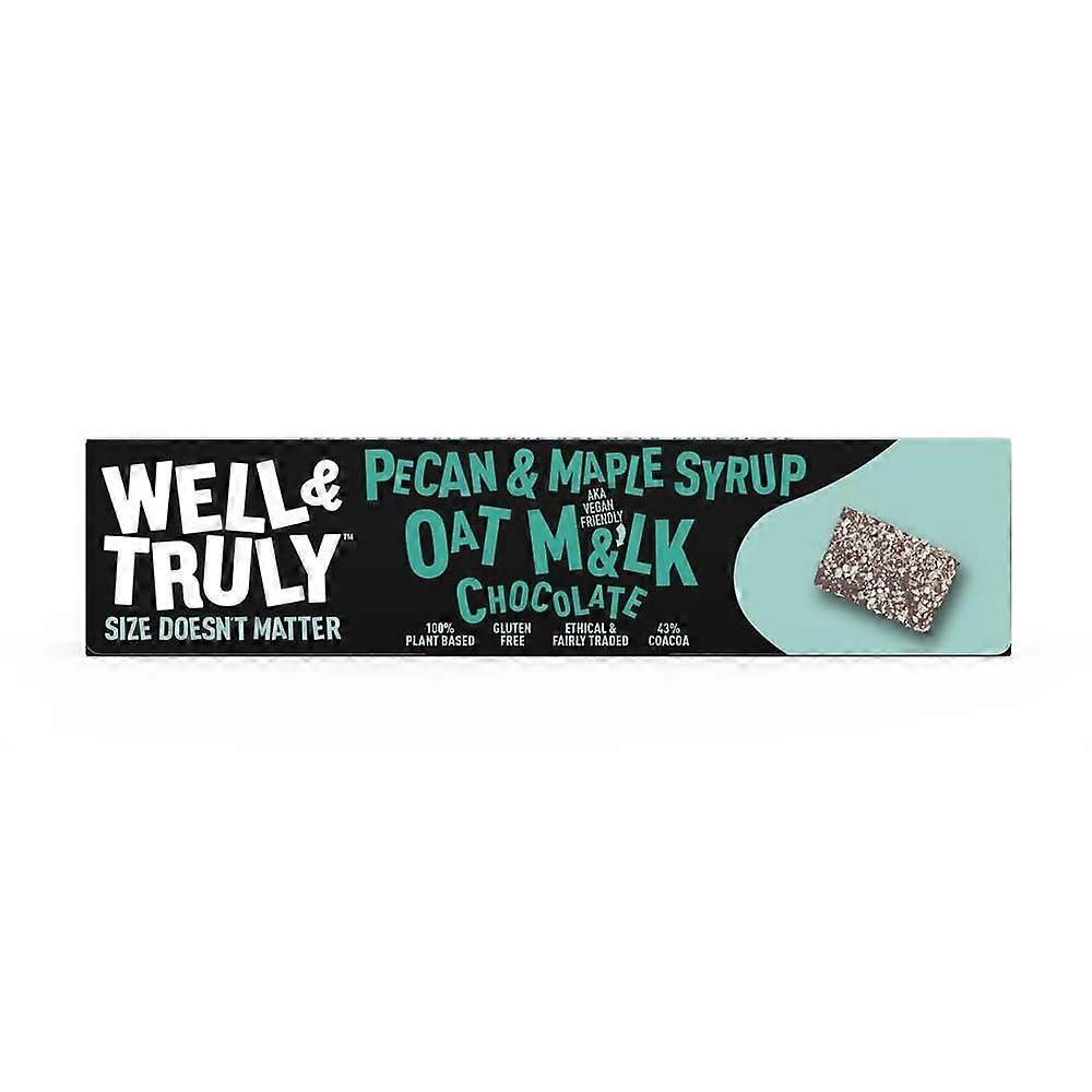 Indulge in the luxurious creaminess of oat milk chocolate, perfectly blended with the rich sweetness of maple syrup and crowned with crunchy pecan nuts. This delightful combination offers a unique and satisfying taste experience that will tantalize your taste buds and leave you craving more. Crafted with single origin cocoa sourced from a B-Corp certified grower, this chocolate not only delights your palate but also supports sustainable and ethical farming practices. It's the perfect treat for those who value quality ingredients and responsible production. Vegan: Suitable for plant-based lifestyles, ensuring no animal products are used. Gluten-Free: Safe for those with gluten sensitivities or celiac disease. Ethically Sourced: Made with cocoa from a B-Corp certified grower, promoting environmental and social responsibility. This 30g chocolate bar makes an excellent snack for any time of daywhether you need a mid-afternoon pick-me-up, a post-workout treat, or a guilt-free indulgence to accompany your coffee or tea. Its convenient size also makes it ideal for on-the-go enjoyment or sharing with friends and family. Experience a harmonious blend of flavors and textures with Well and Truly's Oat M&lk Chocolate Pecan & Maple Syrupa deliciously mindful choice that satisfies both your sweet tooth and your values.