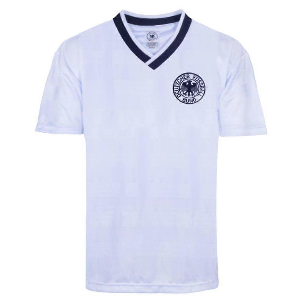 Step back in time with this authentic recreation of the legendary West Germany 1984 retro football shirt. A true piece of football heritage, this classic design pays homage to one of the most stylish eras in international football.Product DetailsCrafted with meticulous attention to detail, this retro shirt captures the essence of mid-1980s German football excellence. The iconic white base features the distinctive black and red trim that made West Germany\'s kit instantly recognisable on pitches across Europe. The traditional crew neck collar and short sleeves deliver that authentic vintage look that football enthusiasts cherish.Made from comfortable, breathable fabric, this shirt isn\'t just about looksit\'s designed for both casual wear and active use. Whether you\'re wearing it to the pub to watch the match, adding it to your collection, or reliving those classic tournament moments, this retro piece delivers on quality and style.Personalisation OptionsMake this legendary shirt uniquely yours with our personalisation service. Add your favourite player\'s name and number from the 1984 squad, or customise it with your own name to create a one-of-a-kind piece. All printing is done to the highest standards, ensuring your personalised details look authentic and stand the test of time.PersonalisationName & Number - Customise your jersey with the name and number of your favourite Germany player or even your own name. We can print name in the same style worn by the players.