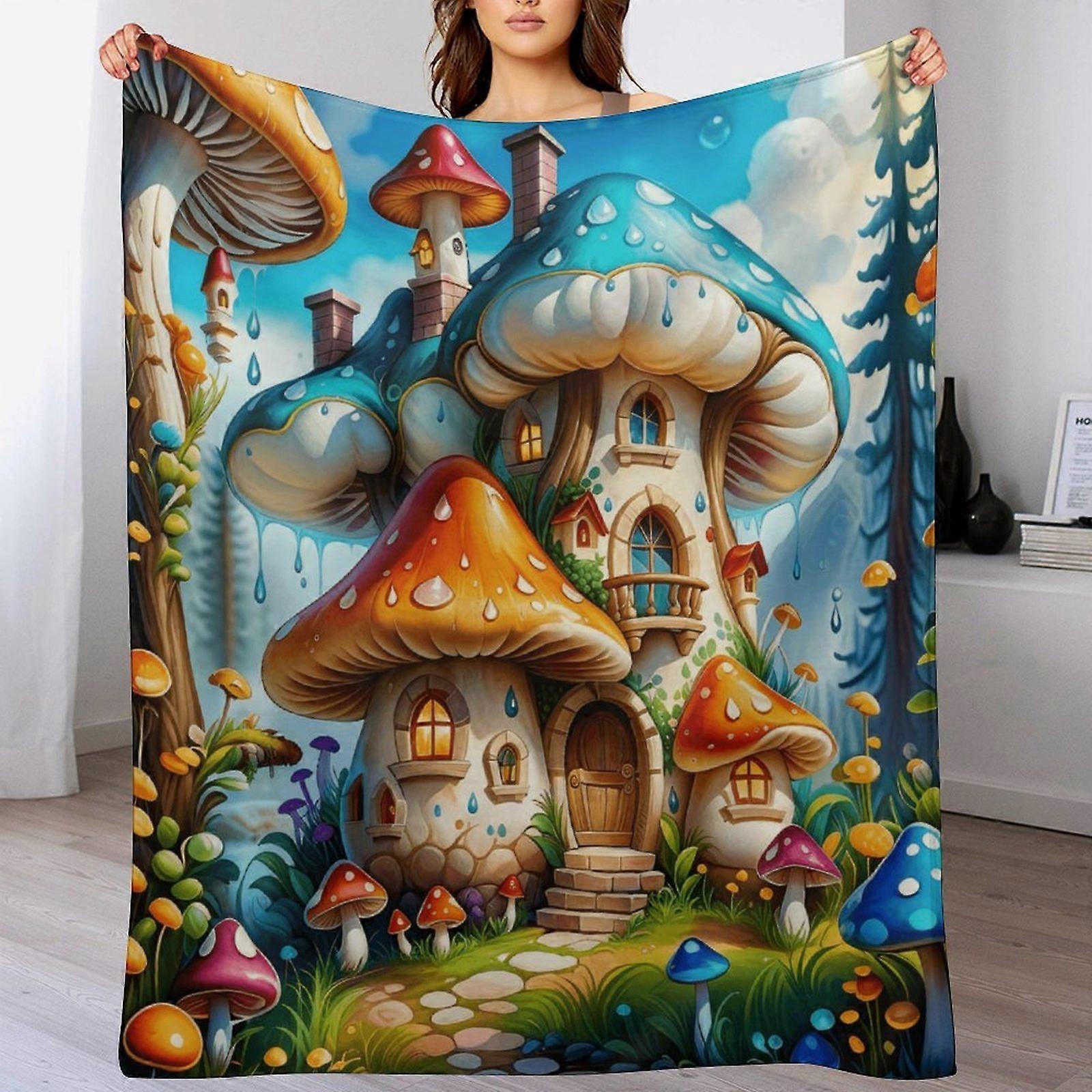 Whimsical Mushroom House Print Flannel Blanket - Cozy Warm Throw for Bedroom | Fairy-Tale Decor for Kids & Fantasy Lovers