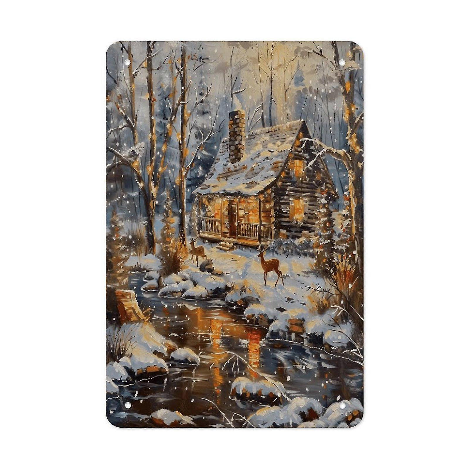 Winter Cabin Forest Metal Tin Sign Snowy Landscape Wall Art Rustic Farmhouse Decor