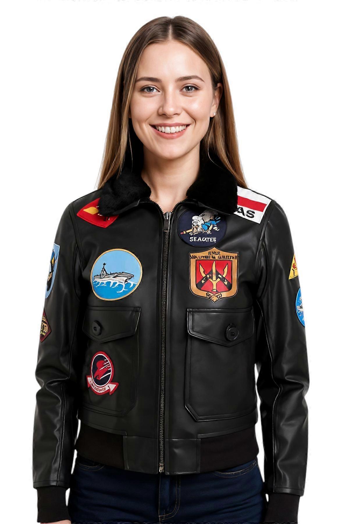 Women's Black Top Gun Tom Cruise Sheepskin Collar Pete Maverick A2 Bomber Leather Jacket