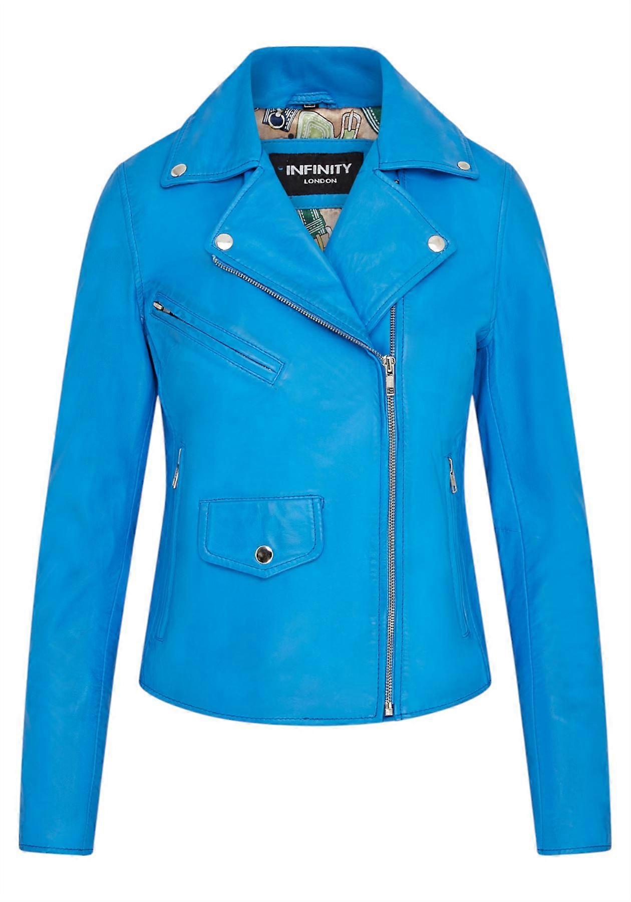 Womens Blue Leather Biker Jacket Classic Brando Moto Real Leather Ladies Jacket