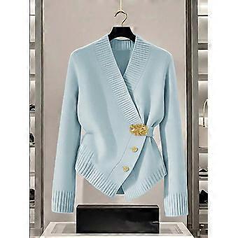 Women's Blue Sweater, New Autumn/Winter Metal Button Asymmetrical Closure Cardigan, Versatile & Minimalist Design For Commuting