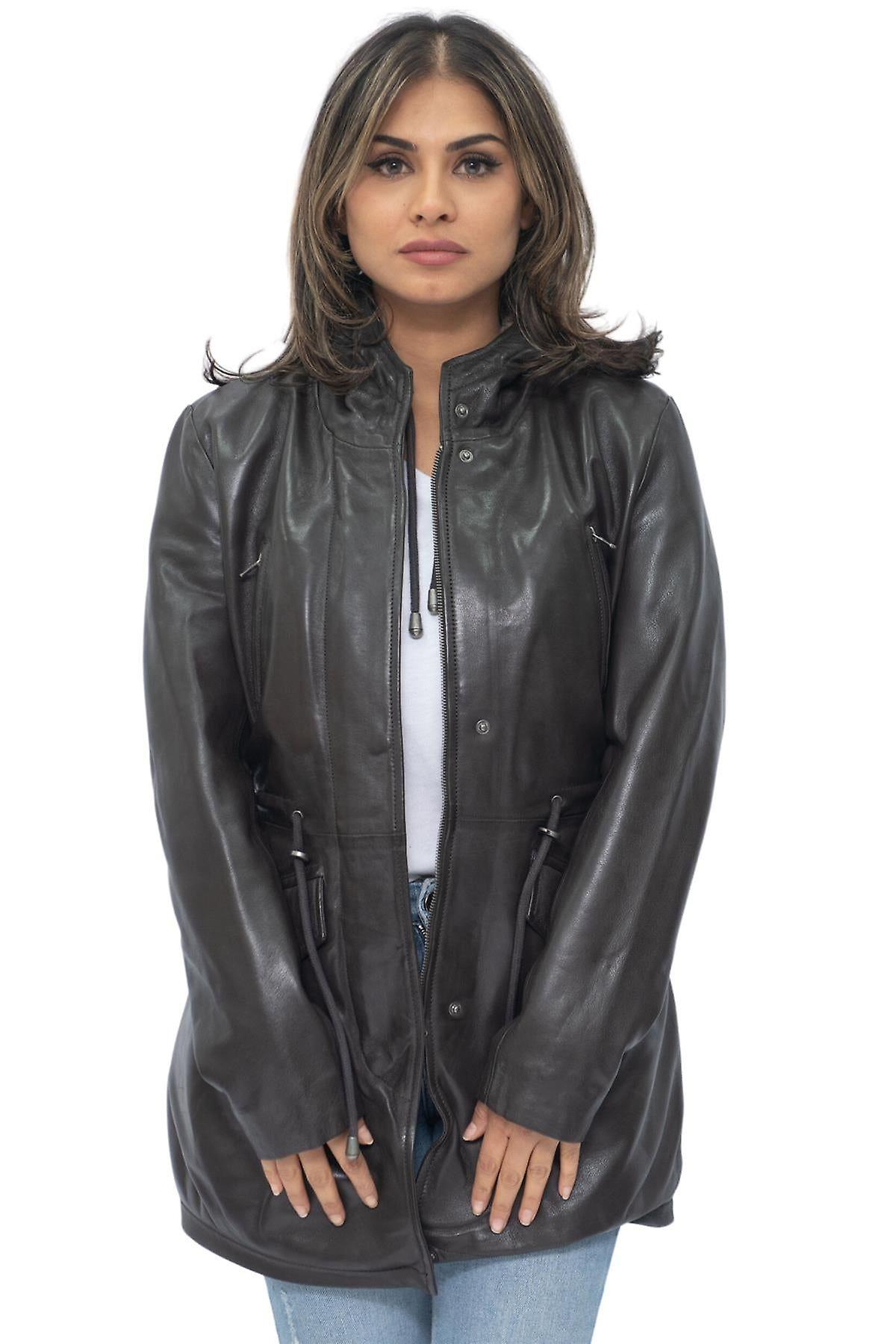 Womens Brown Leather Hooded Mid Length Parka Jacket