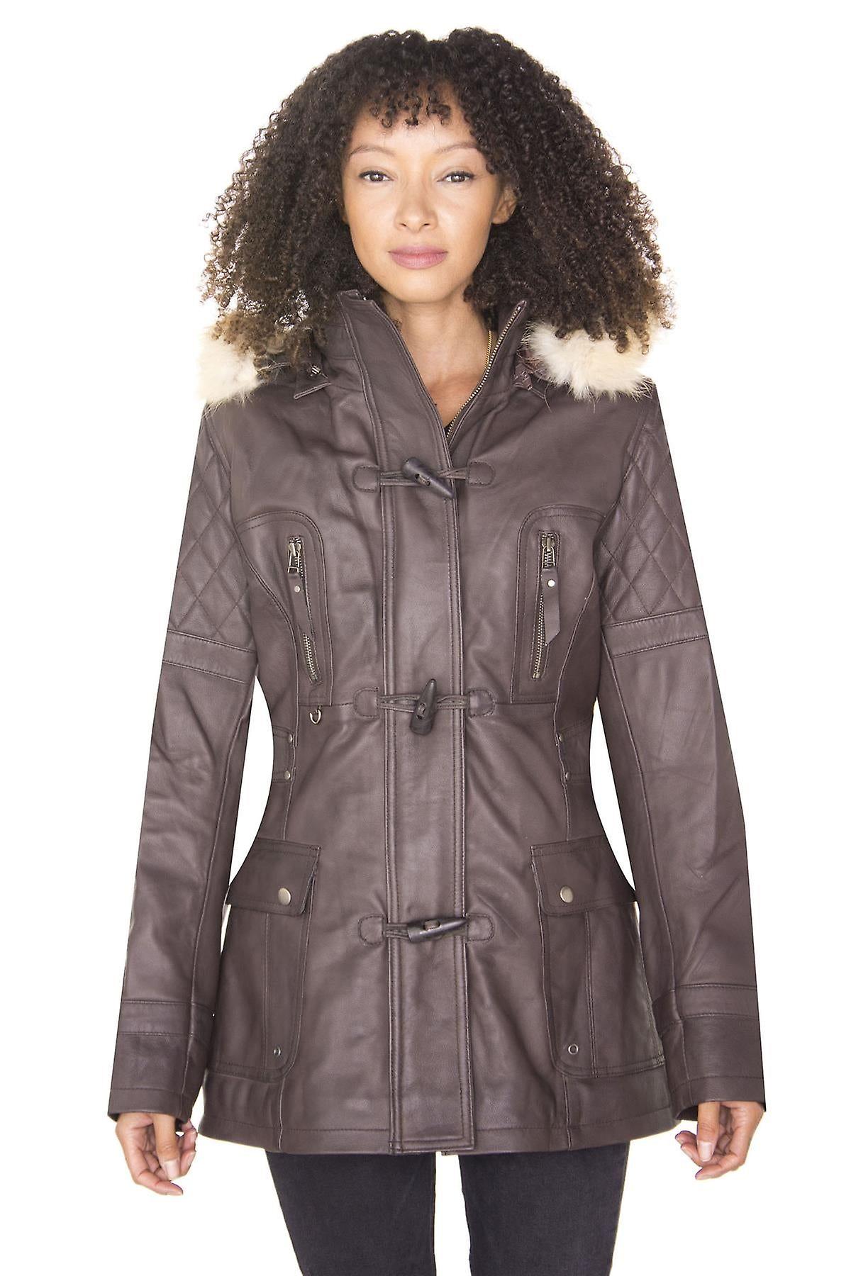 Womens Brown Quilted Leather Hooded Parka Jacket