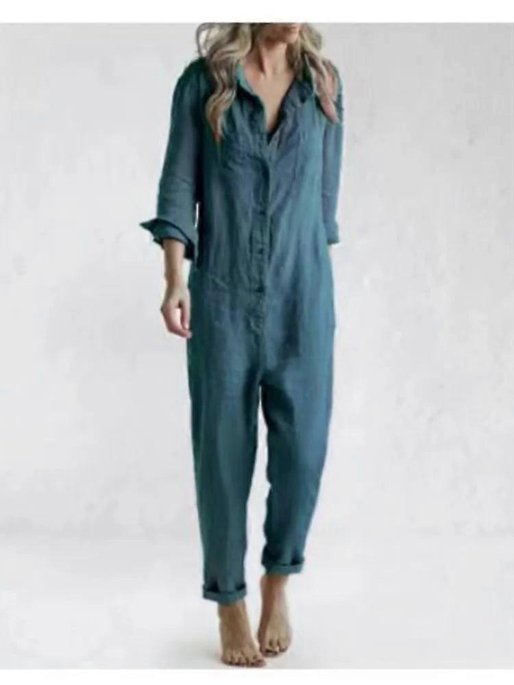 Women's Cotton Linen Long Sleeve Pocket Jumpsuit, Loose Fit Casual Solid Color