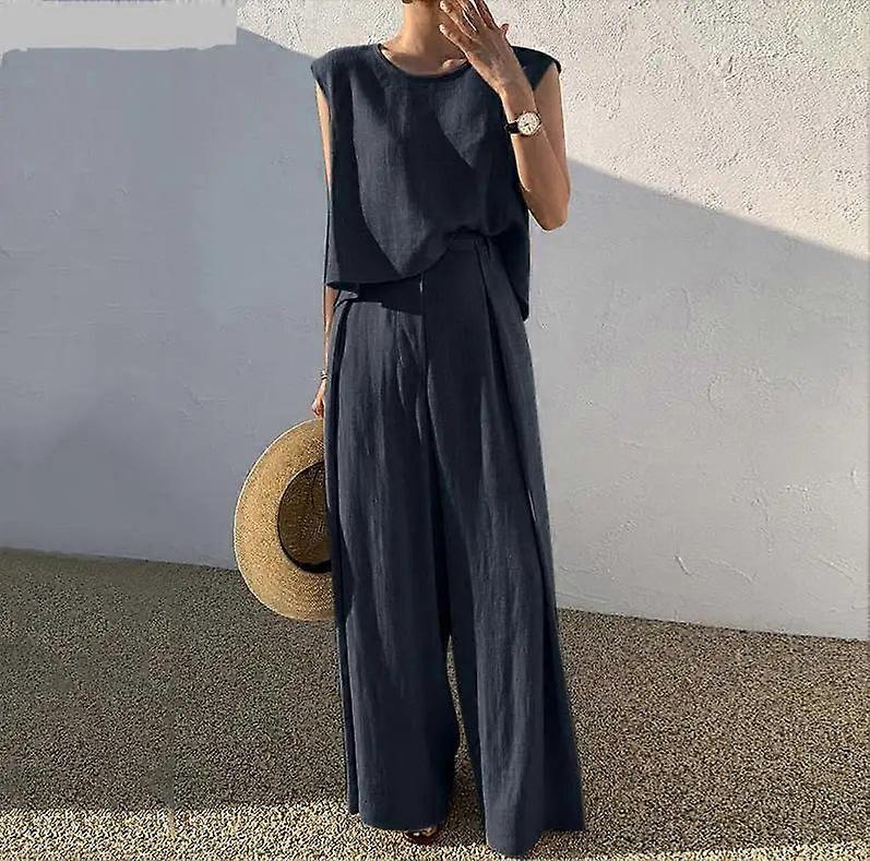 Women's Cotton Linen Two-piece Set: Sleeveless Top & Wide-leg Pants -
