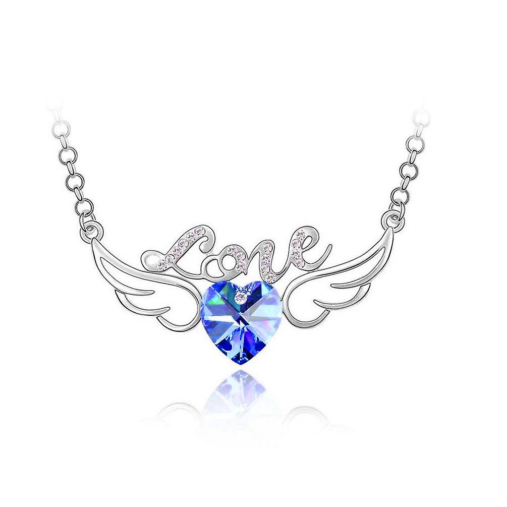 Womens Dark Blue and Silver Love Pendant Necklace with Angel Wings