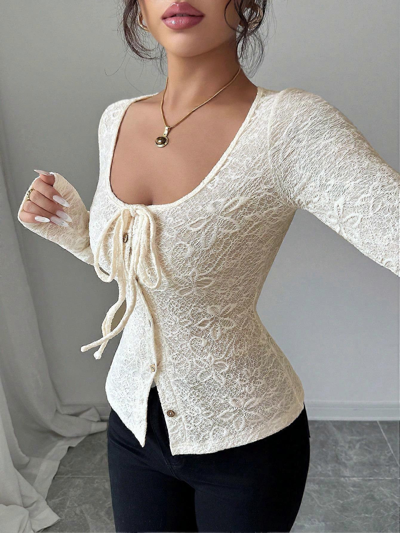 Women's Elegant Solid Color Textured Front Button T-Shirt, Autumn Long Sleeve Black Top Black Tie Top Lace Up Top Tie Up Top