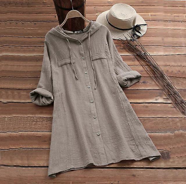 Women's Hooded Drawstring Cardigan Blouse Cotton Linen Solid Color Long Sleeve