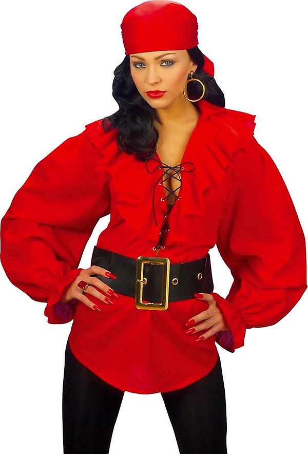 On board This pirate shirt is for women (bandana, earring, belt and pants not included). This pretty top is red. The neckline is tightened with black ties and the sleeves end with elastic. This corsair shirt is ideal to complete your disguise during a carnival or a themed evening. © Copyright Widmann SRL Accessories included: Shirt Material: 100% Polyester Care: By hand