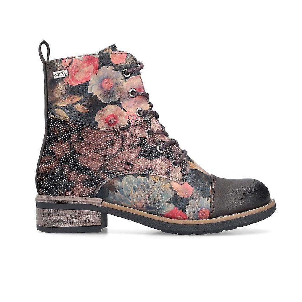 Stay warm, dry, and stylish with the Rieker 94611 women’s zip boots. Featuring a cozy fleece lining and Rieker-Tex water-resistant membrane, these boots keep your feet comfortable and protected in cold, wet winter conditions.   The rugged sole ensures excellent grip and stability, while the side zipper makes them easy to slip on and off. Finished with a fun floral print, the 94611 boots combine fashionable style with practical everyday wear, perfect for winter errands, walks, or casual outings.Fastenings: Zip/Lace Width: F Uppers: Synthetic Linings: Textile Insoles: Textile Outer Soles: Thermoplastic Elastomer Heel Height: 39 mm Features: Water-resistant (Rieker-Tex)