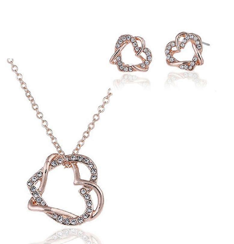 Womens Rose Gold Double Heart Jewellery Necklace And Earrings Set Crystal Stones