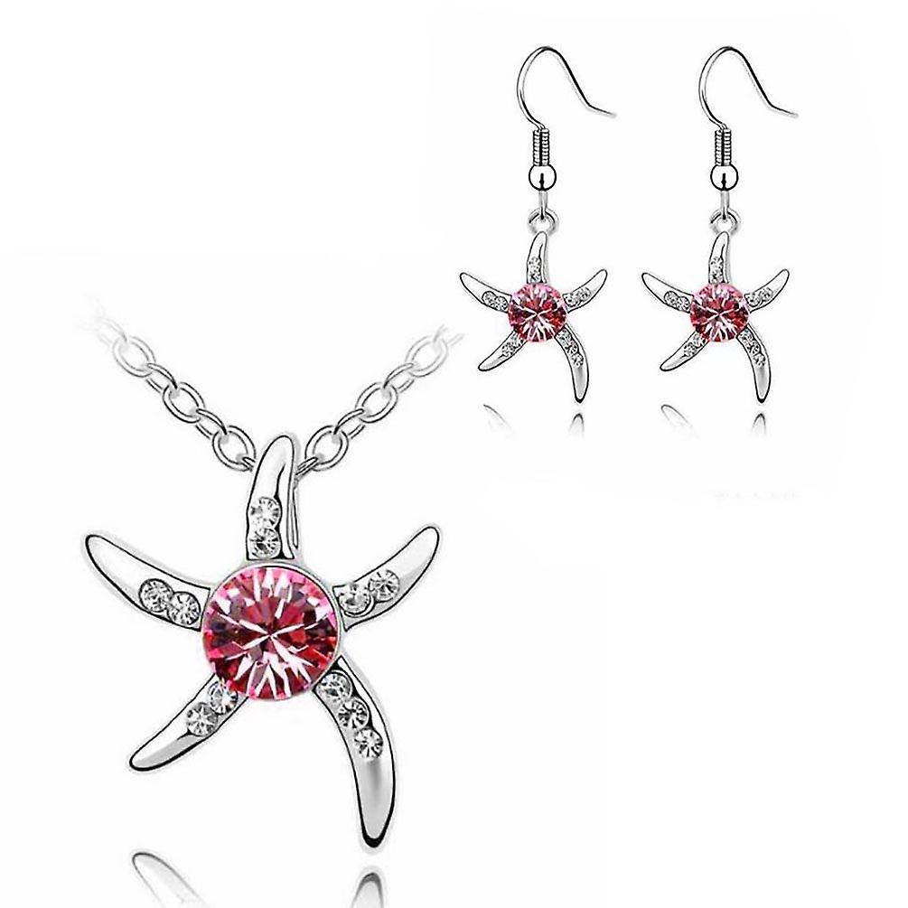 Womens Silver Starfish Necklace And Earrings Set Pink Crystal Stone
