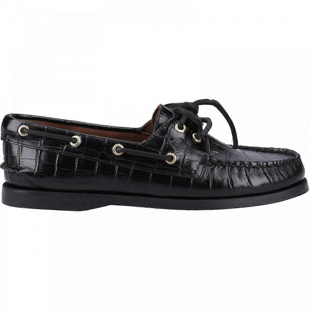 Women's Sperry Authentic 2 Eye | Black | Womens Classic Leather Moccasin Boat Shoes