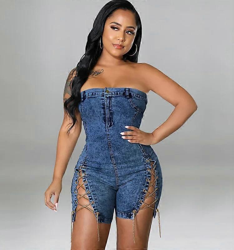Women's Strapless Denim Splice Romper - Slim Fit, Sleeveless, Short Playsuit. This Stylish Women's Playsuit is Designed for a Chic and Effortless Look, Perfect for Your Summer Wardrobe. The High-waisted, Skinny Fit Ensures a Flattering Silhouette, While the Solid Pattern and Straight Cut Offer a Sleek, Modern Aesthetic. Crafted from High-quality Polyester Broadcloth, This Playsuit is Both Durable and Comfortable, Making It Ideal for Casual Outings. With a Non-stretch Elasticity, It Maintains Its Shape and Provides a Polished Appearance. Features: - Type: Playsuit - Season: Summer - Fit Type: Skinny - Waist: High Waist - Fabric Type: Broadcloth - Material: Polyester (91%-95%) - Pattern: Solid, Straight - Style: Casual - Thickness: Standard Step into Summer with Confidence and Style with This Must-have Playsuit.. Your order tracking code will be sent on shipping and takes up to 5 days to show live information.