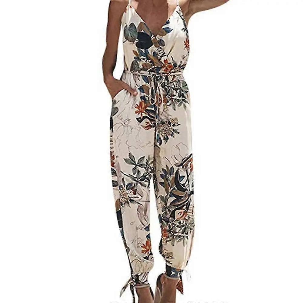 Women's Summer Backless Floral Print Strappy Jumpsuit Romper - Deep V Casual