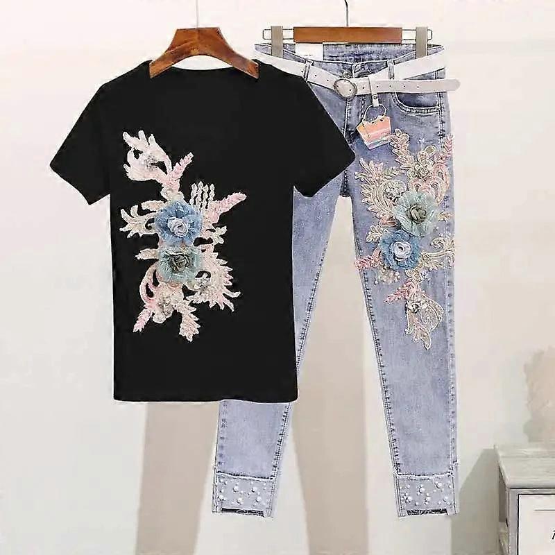 Women's Summer Embroidered T-shirt & Jeans Set 2024 - Casual Two-piece Outfit,