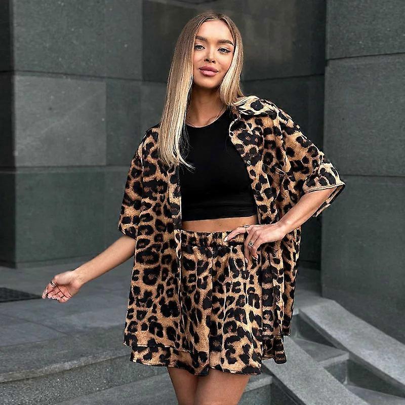 Women's Summer Leopard Print Two-piece Set - Short Sleeve Shirt & Shorts -