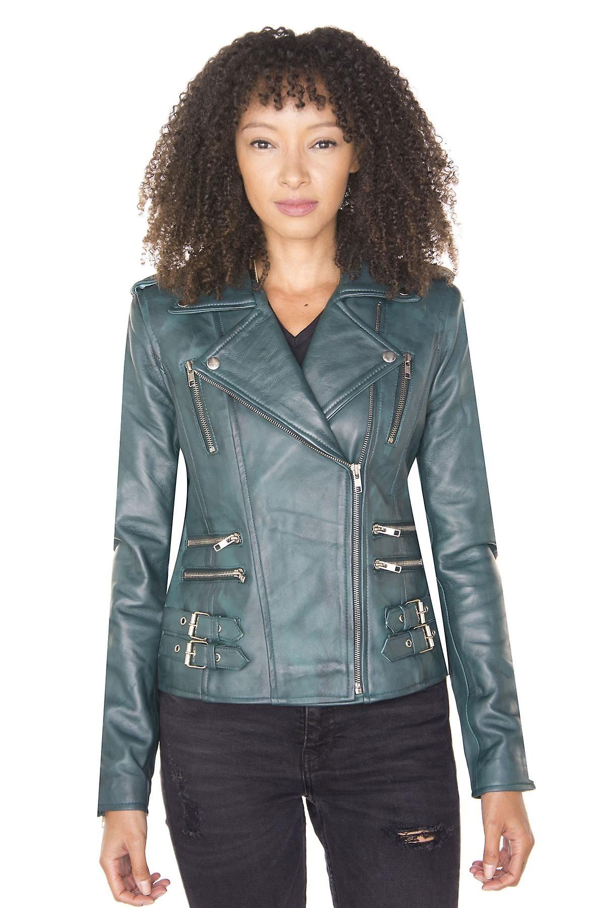Womens Teal Classic Leather Vintage Brando Biker Jacket
