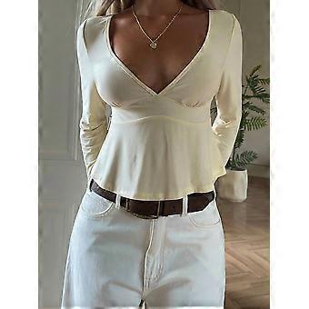 Women's V-Neck Ruffled Shoulder Long Sleeve T-Shirt, Light Yellow, Fashion
