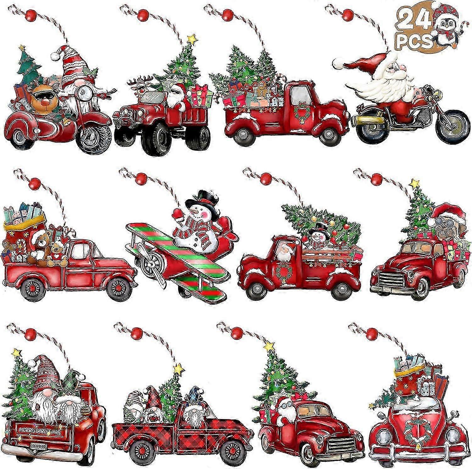 Christmas Wooden Hanging Ornament: The package comes with 24 pieces of Christmas wood slice ornaments in 12 unique designs. Wood ornaments by imitation of watercolor painting are actually laser painted which stills looks like handmade crafts.Rustic Christmas Decoration: Red trucks with Christmas Trees, Santa Claus, Snowman, Gnomes, Motorcycles and Airplanes. All of them are in rustic and classic patterns, looks bright and joyful.Clearly Printing and Nicely Cutout: The Christmas wooden ornaments are clear in painting, bright in color, with smooth surface and polished edges. Nicely cut with laser. Empty backside allows your kids to DIY using their creativity.There is a hole on the top of each slice. Every piece has equipped with a rope in red interlaced with white and a red bead. Convenient for you to hang on the tree, or attach to the gift bag.It can be used to decorate Christmas trees, windows, fireplace, doors, cabinets, gift boxes, etc. Used as a Christmas gift for family members or kids. Red wooden slices add a fun and whimsical element to your holiday.