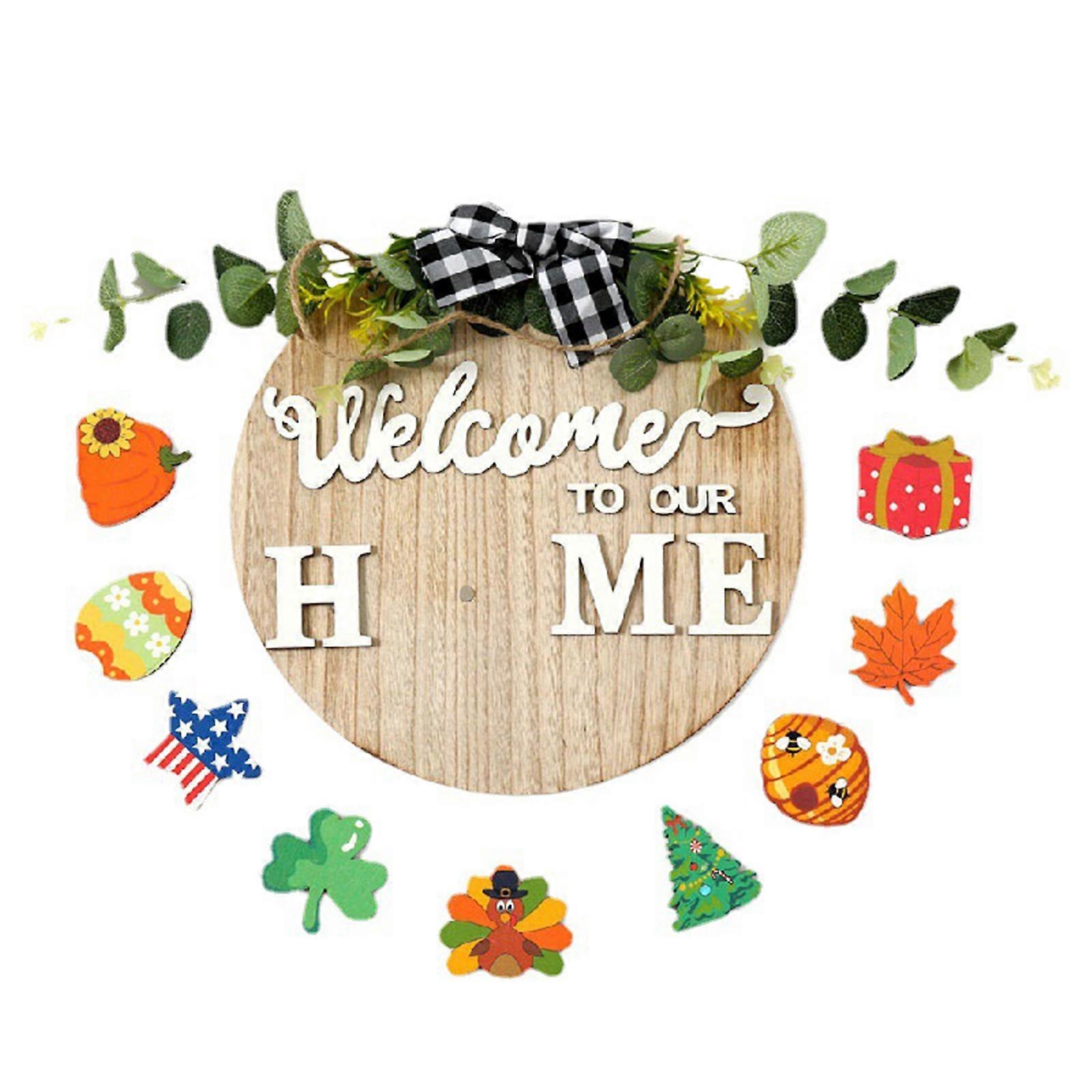 Wooden Guest Welcome Sign Front Door Wood Round Hanging Sign Guest Welcome Sign + Seasonal Small Country Porch Signs Front Door Door DecorFeaturesThe Front Door Guest Welcome Sign is made of 12 inches diameter wood, with a lanyard for easy hanging. The interchangeable welcome card is handmade, with fabric bows, eucalyptus wooden boards, and interchangeable signs. With 9 types of cute signs to use, 9 types of cute signs cover almost all seasons and festivals. There are magnets on the back of the logo and on the plate for easy installation. The interchangeable welcome sign printed with welcome to our home is the perfect sign to welcome family and guests. At the same time, she can also decorate her home, adding a warm and joyful atmosphere to her home. Specification-Color: As shown-Material: Wood-Diameter: 30cm/12inch-Hanging rope height: 16cm/6.3inNote:Please allow 1-3cm (0.4-1.18") difference due to manual measurement and slight color change for different display setting. Packing List: 1 * Guest Welcome Sign9 * Interchangeable Seasonal Small Signs