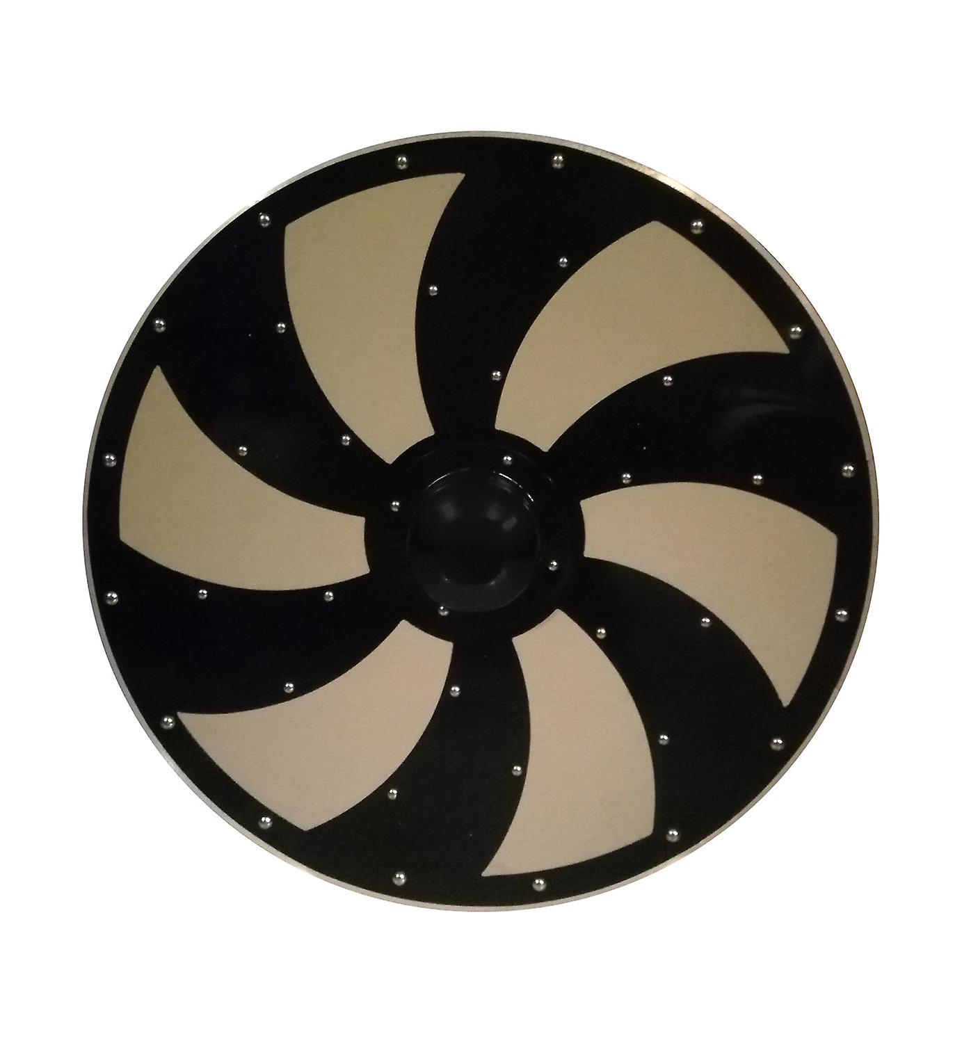 Specifications: Overall diameter: 59 cm Base material: Wood base covered with leather (back and front), Metal plate on top, hand cut, fitted Surface material: Aluminium edge wrapping, designed with a plasma cut steel sheet on top of wood, steel ornaments. Center Dome material: Metal Thickness: 19 mm without handle or center cup Weight: Approx 4250 g Features: Leather grip and strap, the shield can be hanged with the provided chain. Handmade product. This product is made by hand and is not a mass-produced item. Due to the nature of making it with original hand working tools, slight variations may exist from the pictures. It is manually measured, there may be 2-3 mm error. Package includes: 1 x Shield 1 x Hanging chain (not screwed)